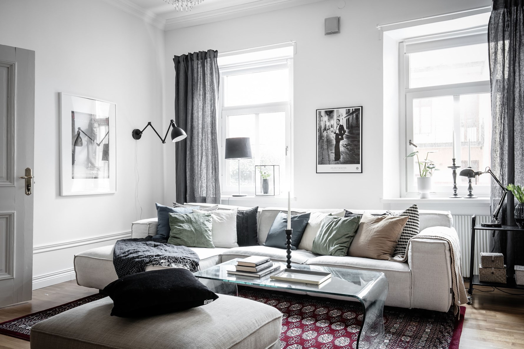 Vardagsrummet är stort och luftigt, flertalet möbleringsalternativ lämnas med gott om plats för soffgrupp, fåtölj och TV-hörna. De stora fönsterpartierna på rad ger ett behagligt ljus och en känsla av rymd. Höga fotlister, högt i tak med svala taklister, vacker takrosett och framtagen tegelvägg är några ledord för denna stora sällskapsyta. Golvet är belagt med ekparkett. Dubbla dörrar leder oss ut på den trivsamma balkongen med vy över gården, plats för möbler, växter och vänner.