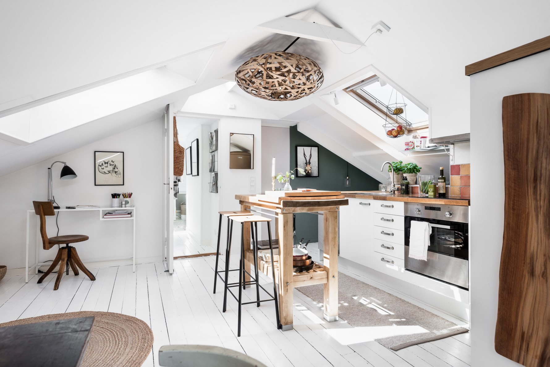 Via den vita originaltrappan med handräcke i trä nås bostaden och ni välkomnas in till ett kök och vardagsrum i en öppen planlösning. Ni har rikligt med ljusinsläpp från fina takfönster samt gavelfönstret i vardagsrumsdelen. Mycket ljus och härlig känsla tack vare det vitmålade brädgolvet och de ljusa ytskikten på väggarna.