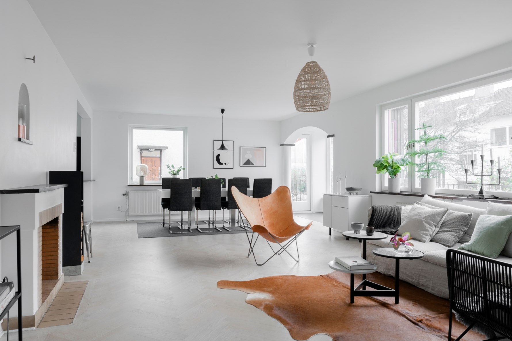 Från hallen nås det luftiga sällskapsrummet, här vill man vara! Ljuset flödar från de stora fönsterpartierna ut mot den härliga omgivningen. Rummet har plats för soff-del, mysfåtöljerna framför den öppna spisen och matsalsbord för det stora kalassällskapet. Burspråk med altandörr leder oss ut mot balkong och trädgård belägen mot sydväst.
