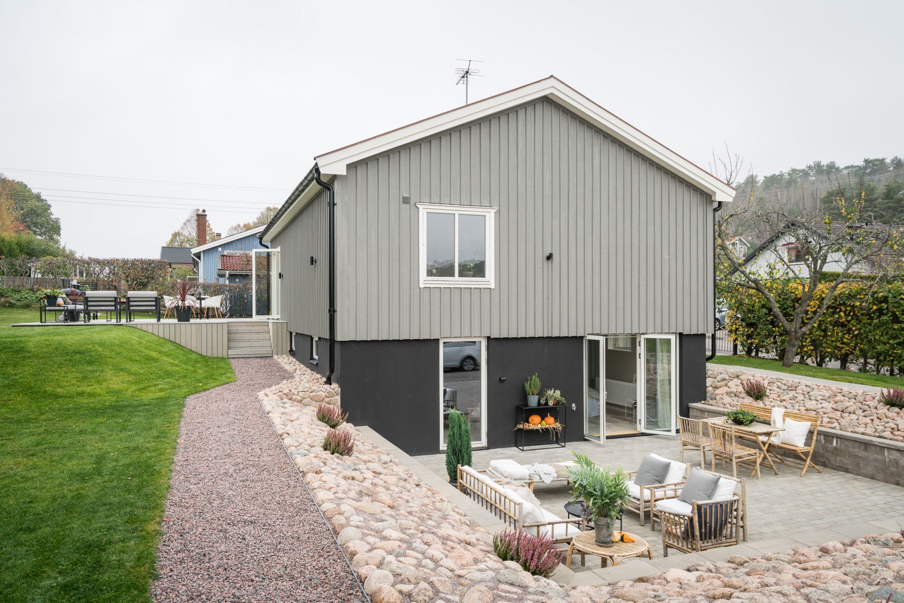 En trappa ner möts man av ytterligare ett vardagsrum som har utgång till en stor härlig uteplats i soligt söderläge. Detta plan har genomgående vitvaxad enstavsparkett i ek och målade väggar i en ljusbeige ton.