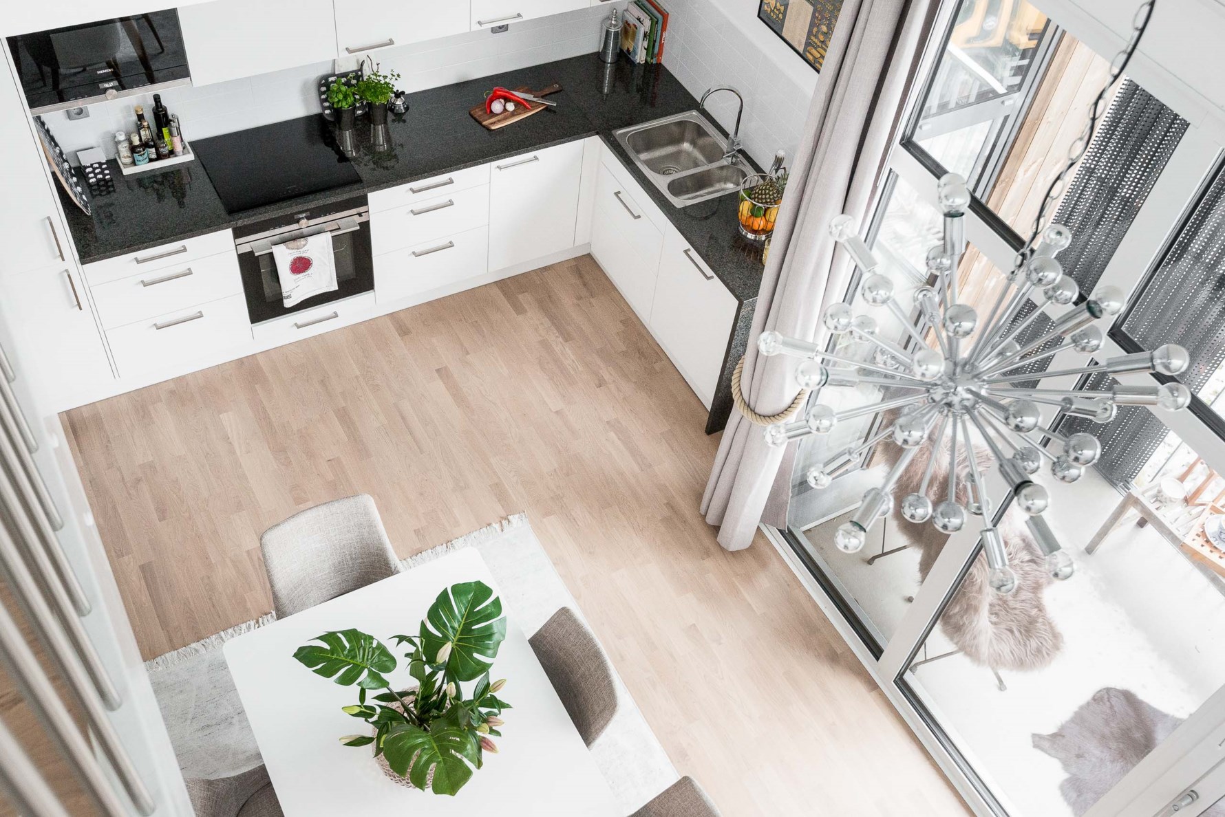 Ni har ett kombinerat kök och allrum där den öppna planlösningen bjuder in till samvaro och gemenskap. Köket har vita släta luckor från Marbodal där skåpen sträcker sig ända upp till taket vilket skapar extra förvaringsutrymme. En blankpolerad bänkskiva i granit med waterfall ned mod golvet som ger ett vackert avslut vid bänkens kortsida. Granitskivan är mycket tålig och möjliggör mycket yta vid matlagning. Den maskinella utrustningen består av en induktionshäll, fläkt, ugn, inbyggnadsmikro i behaglig arbetshöjd, integrerad diskmaskin samt kyl/frys. Samtliga vitvaror är från Siemens.