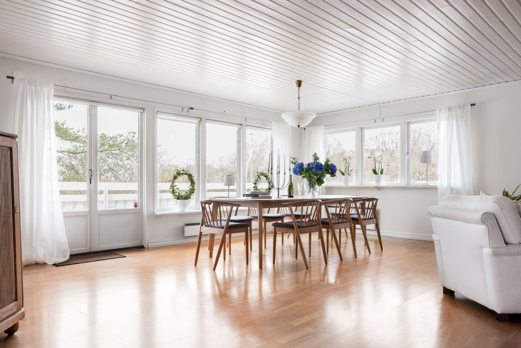 Trevligt välkomnande hall med vackert stengolv vid entrén vilket övergår i parkett längre in och som är genomgående i hela huset. Ytterkläderna hängs snyggt in i garderober med jalusidörrar.