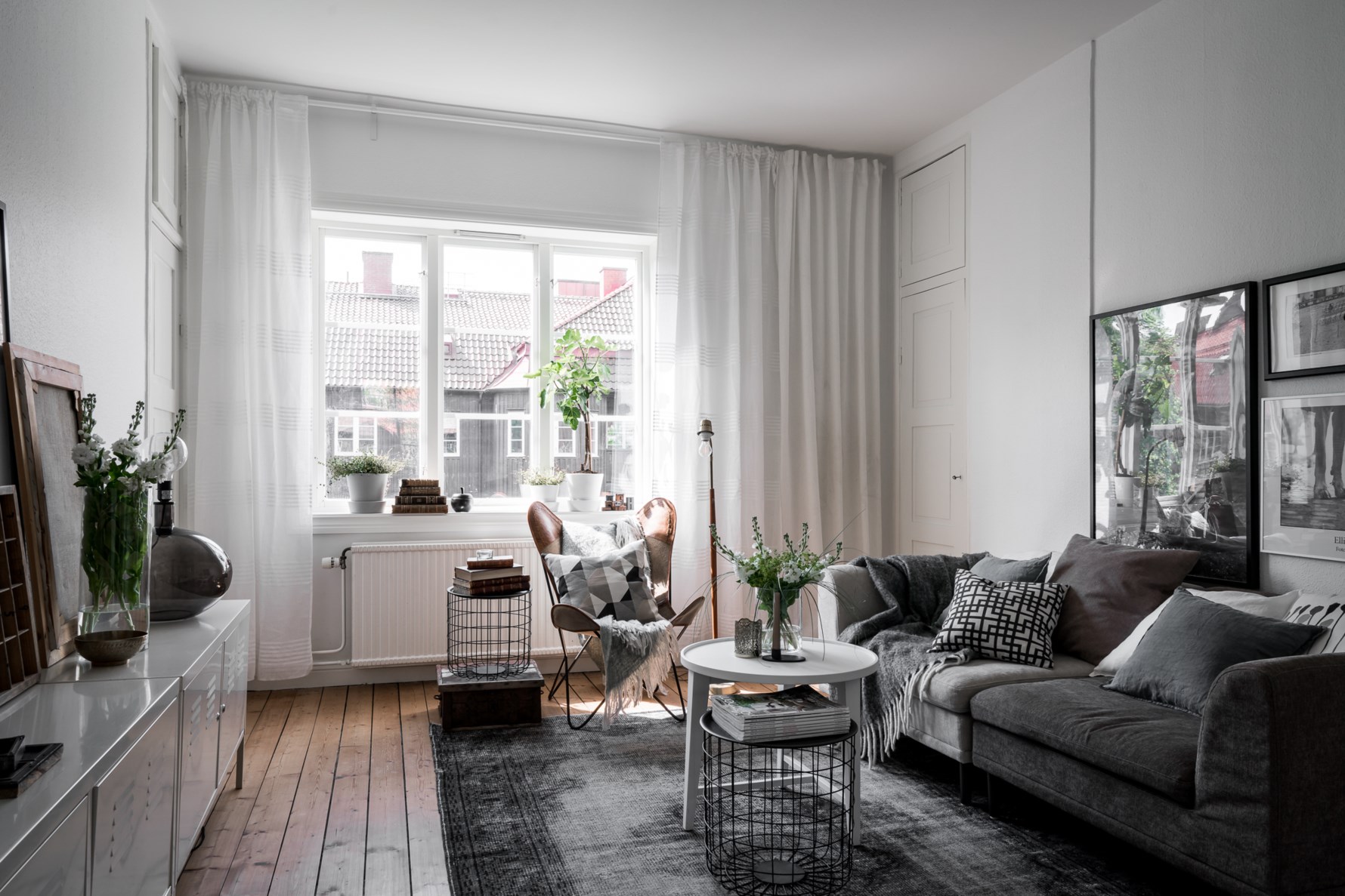 Vidare in finner ni det mysiga vardagsrummet. En perfekt plats för avkoppling och kvalitetstid med vänner och familj. Ni finner olika möbleringsalternativ som inkluderar en soffgrupp, bord och tillhörande tv-möbel. Rummet erbjuder även goda förvaringsmöjligheter i två mindre garderober i original. Ett fint fönster låter solensstrålar reflektera fint i de vitmålade vägarna. På golvet ligger ett härligt brädgolv i original.