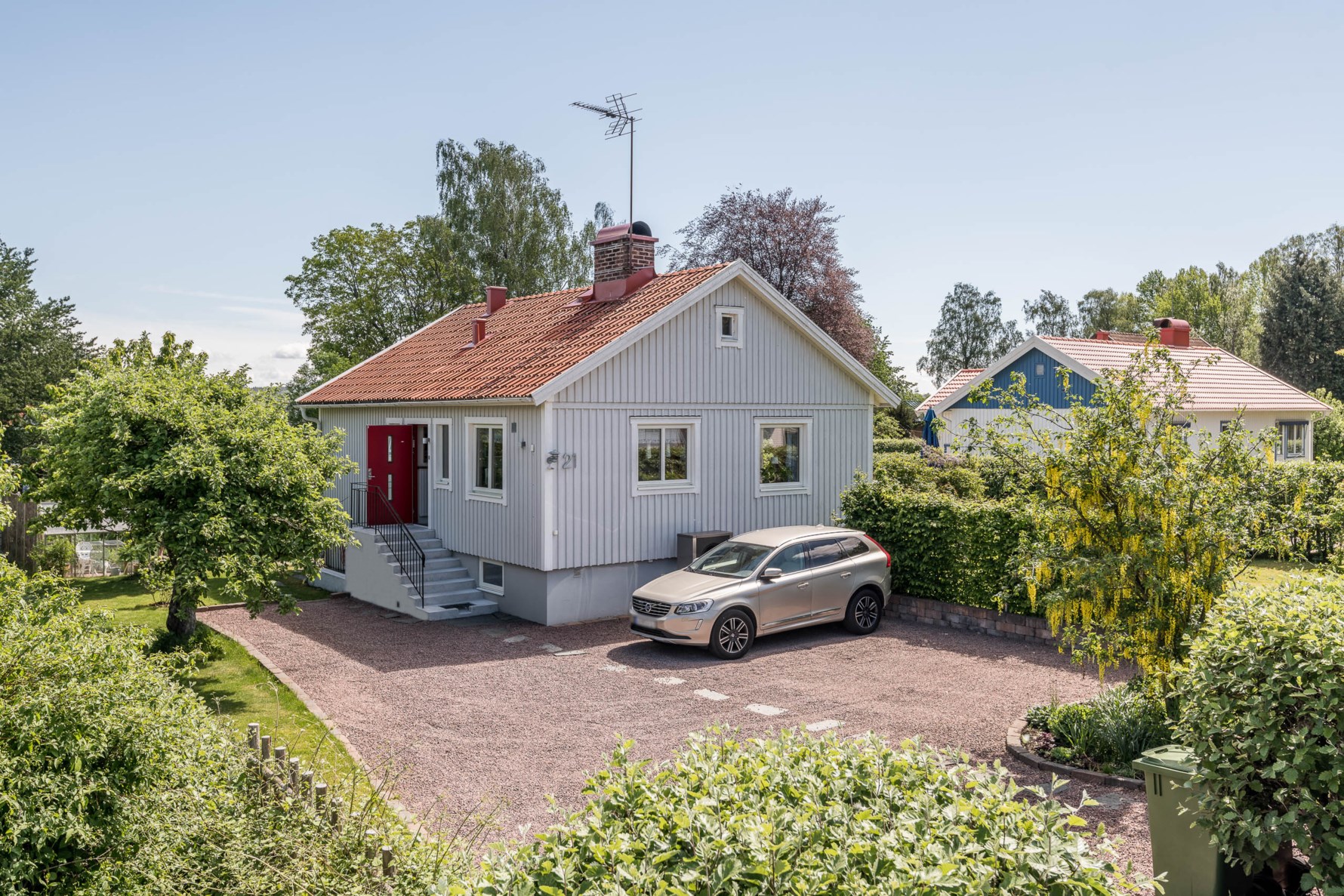 En ljus och inbjudande entréhall välkomnar oss och här finns plats för avhängning av ytterkläder och skor. Inbyggt vitrinskåp ger bra förvaring i anslutning till köket. Grått klinkergolv som möter ekparkett längre in i hallen.