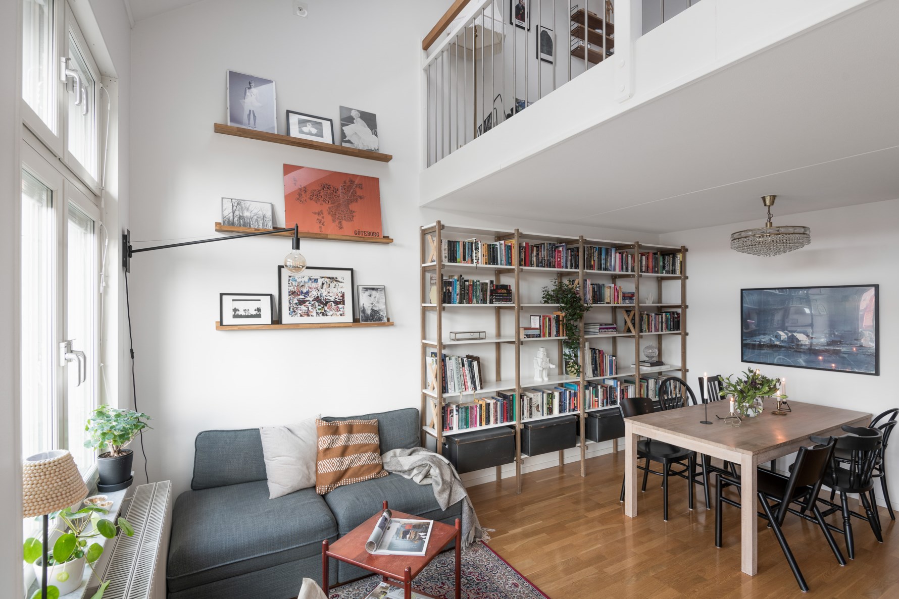 Via trappan tar ni er upp till etagevåningen. Allrummet här är rymligt och det rostfria staketet blir en snygg inredningsdetalj. Framme vid staketet kan ni blicka ned mot vardagsrum och balkongen. Detta våningsplan har även två mysiga sovrum, ett master med utrymme för en större dubbelsäng och förvaring via ett linneskåp. Snedtaket ger karaktär och väggarna är målade i ljus färg och på golvet finner vi parkett. Det andra sovrummet disponeras idag som barnrum men rummet passar lika bra som gästrum, arbetsrum eller kontor. Väggarna är vita och på golvet ligger parkett. Förvaring via en garderobsvägg.