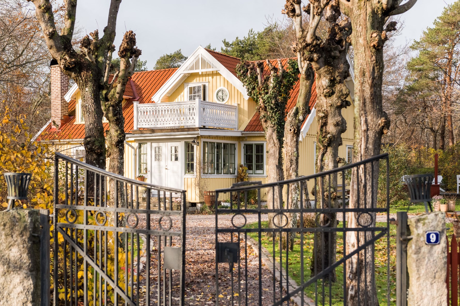Stentrappan leder upp till en charmerande glasveranda som utgör husets entréhall, och välkomnar med dagsljus samt pärlspont på väggarna. Här finns möjlighet till avhängning och förvaring och golvet utgörs av naturfärgat klinker.