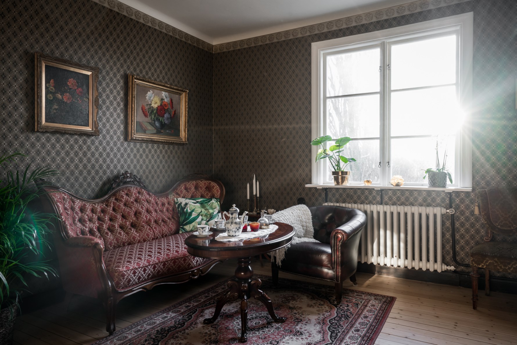 Från hallen finner man vardagsrummet. Lägenheten renoverades varsamt 2017-18 och ytskikten är perfekt skapade för bästa känsla av en resa bak i tiden. Det gedigna originalbrädgolvet i samband med de mörka tapetserade väggarna gör detta till en harmonisk plats för umgänge. Då vardagsrummet är rymligt har man möjlighet att möblera med både soffgrupp och extra kontorshörna, läsfåtölj eller varför inte med ett matsalsbord. Skönt ljusinsläpp.