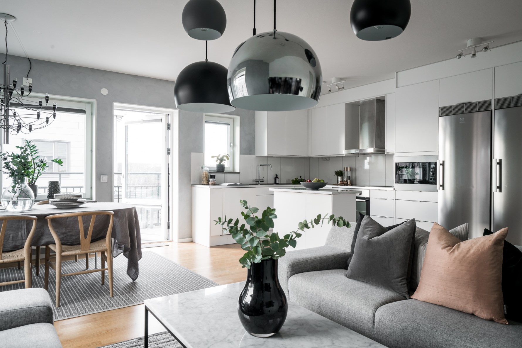 Ljust vardagsrum och kök i öppen planlösning med härligt gavelläge. Här kan man inreda med soffa och matplats. Ljusinsläpp från generösa fönsterpartier i två väderstreck med måttanpassade plissé-persienner samt utgång till lägenhetens stora takterrass med utsikt över omgivningarna. Terrassen har fjärrstyrd markis som uppskattas under varma soliga dagar och infravärme som ger extra värme under kyliga kvällar och årstider.