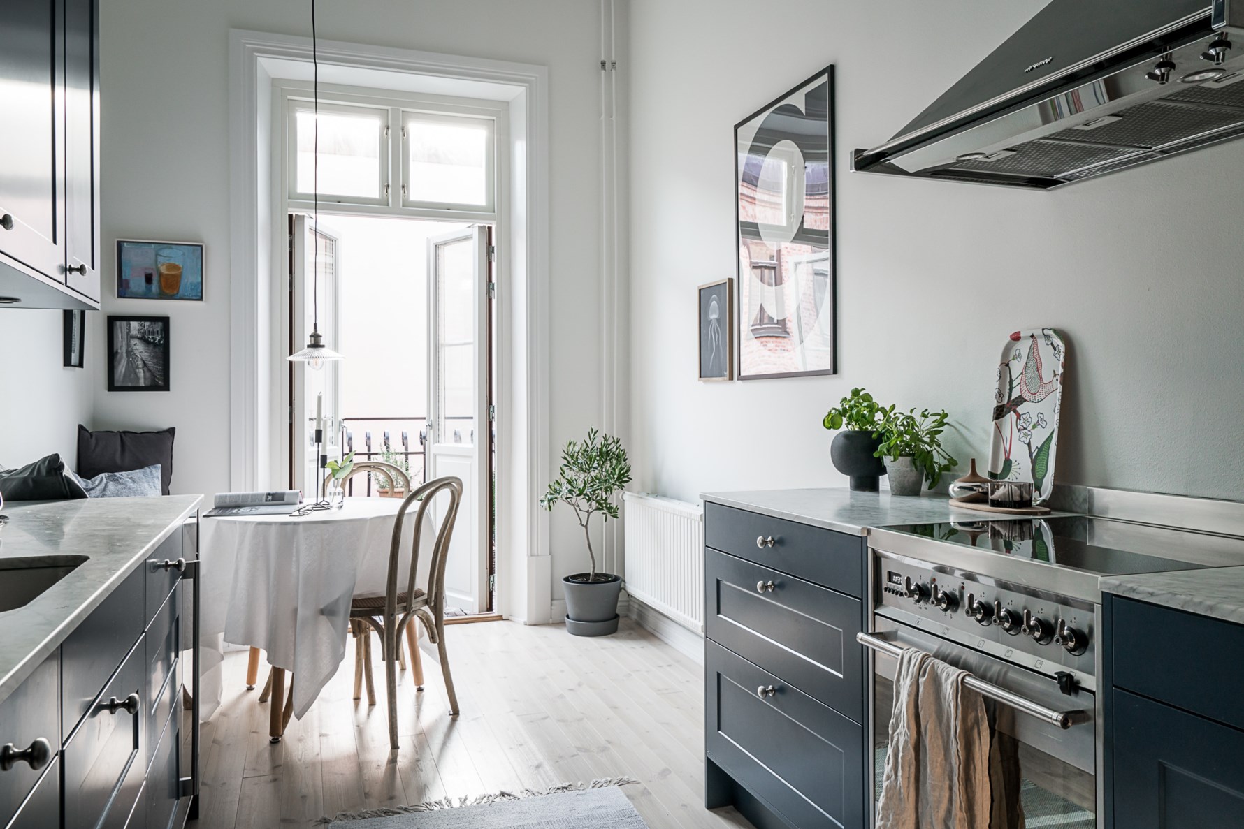 Högskåpen reser sig ända upp mot taket, vilket ytterligare förstärker den generösa takhöjden samtidigt som utrymmet utnyttjas maximalt. Att överskåpen koncentrerats till ena sidan av köket ger rummet rymd och ger ett fint insläpp av dagsljuset som strilar in genom de vackra spröjsade pardörrarna ut mot balkongen. Intill balkongdörrarna finns plats för ett matbord som kan dukas för minst fyra gäster. En platsbyggd sittbänk med blå luckor i enlighet med resten av rummet ger extra förvaring. Det ljusa brädgolvet ger en både rustik och elegant känsla åt rummet och framhäver kökets vackra fotlister och profilerade dörrfoder. Här är alla detaljer noggrant utvalda och det är tydligt att inget har lämnats åt slumpen. Blandaren i klassisk stil har valts i rostfritt för att matcha den underlimmade vasken och eluttagen är runda för att påminna om husets aktningsvärda ålder. De kvalitativa vitvarorna består av integrerad kyl och frys från Bosch, integrerad diskmaskin från Bosch, golvspis med induktion, inbyggd självrengörande ugn och svart köksfläkt med rostfria detaljer från det exklusiva märket Smeg. En vinkyl från Temptech hjälper dig att alltid ha något gott tillhands vid tillfällen att fira.
