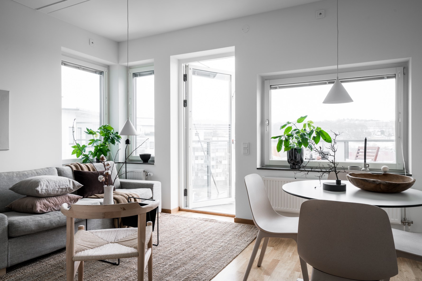 I vardagsrummet finns plats för en mysig soffa med ett mindre soffbord. Härifrån nås den stora balkongen i sydöst, som bjuder på långa soliga förmiddagar med vidsträckt utsikt över grannarnas takåsar och lummiga omgivningar. Det höga läget, högst upp på våning fem, ger en härlig frihetskänsla och skydd från insyn.