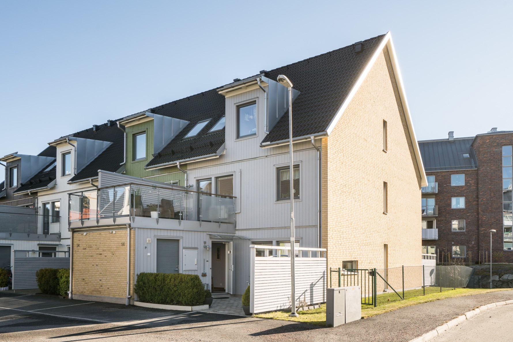Till huset hör två parkeringsplatser, den närmaste av dem endast några steg från ytterdörren. Vid husets plattlagda entré finns den första av husets fina uteplatser, väl skyddad av träplank och en vintergrön häck. Trädgården sträcker sig runt husets gavel och är inhägnad av ett staket med låsbar grind. Förråd finns på båda sidor om huset.
