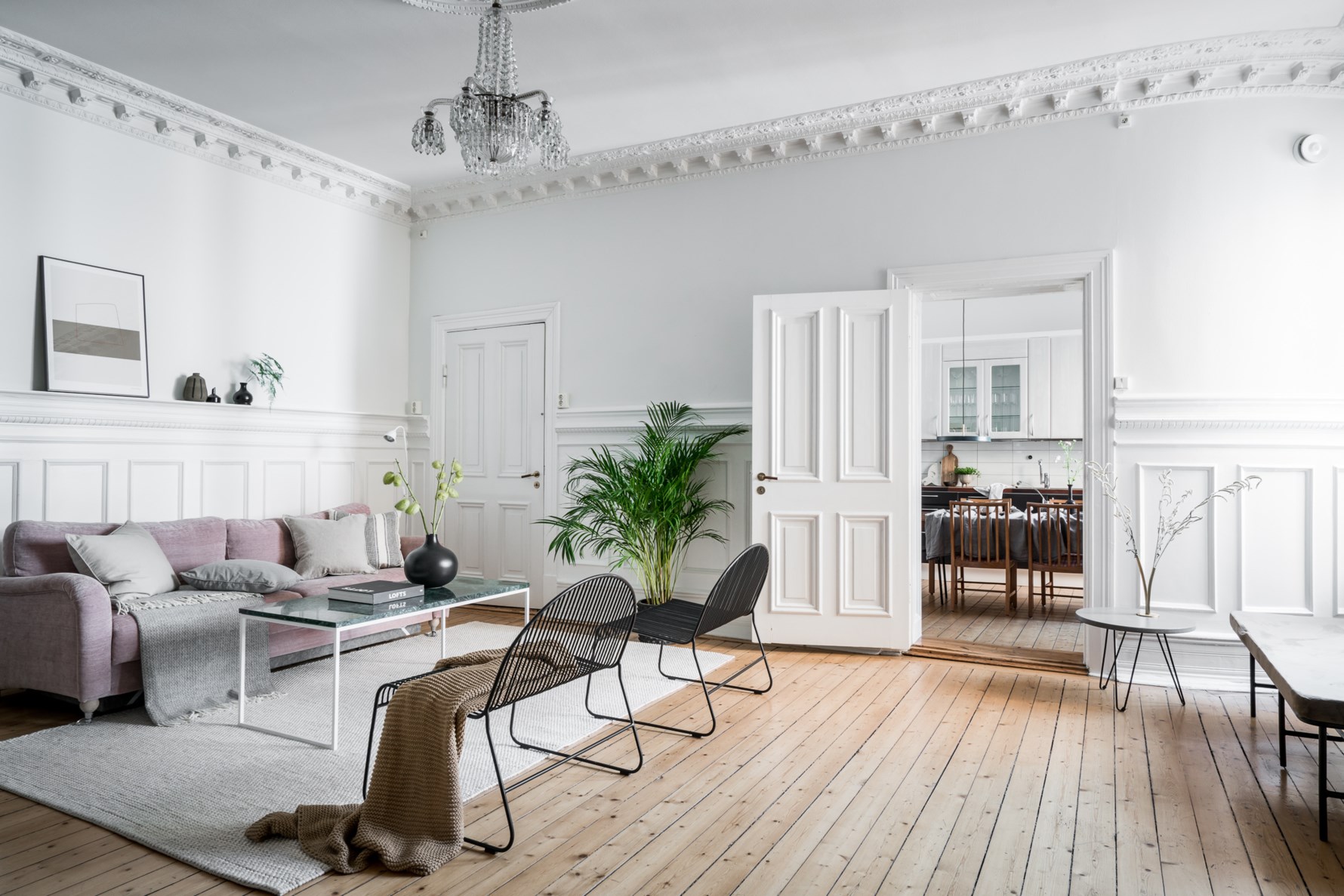 Ta er upp till tredje våningen och ni välkomnas in i hallen där golvet är belagt med stora grå granitklinkerplattor tillsammans med vitmålade väggar. Redan här slås ni av den fantastiska takhöjden över tre meter och vackra tidstypiska detaljer som ger en känsla av svunna tider.