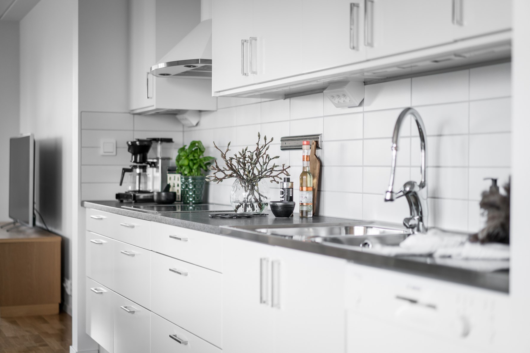 I köksdelen finns det såväl plats som möjlighet att laga mat tillsammans med vänner och familj. Skåpluckor och lådor går i vitt. Bänkskiva i laminat och vitt kakel på vägg. Goda förvaringsmöjligheter för köksredskapen i flertalet över- och underskåp. Vitvarorna består av spishäll, köksfläkt, integrerad diskmaskin, inbyggd ugn och mikro i bra arbetshöjd samt fullstor kyl och frys. Väggarna är målade i vitt och på golvet ligger ekparkett.