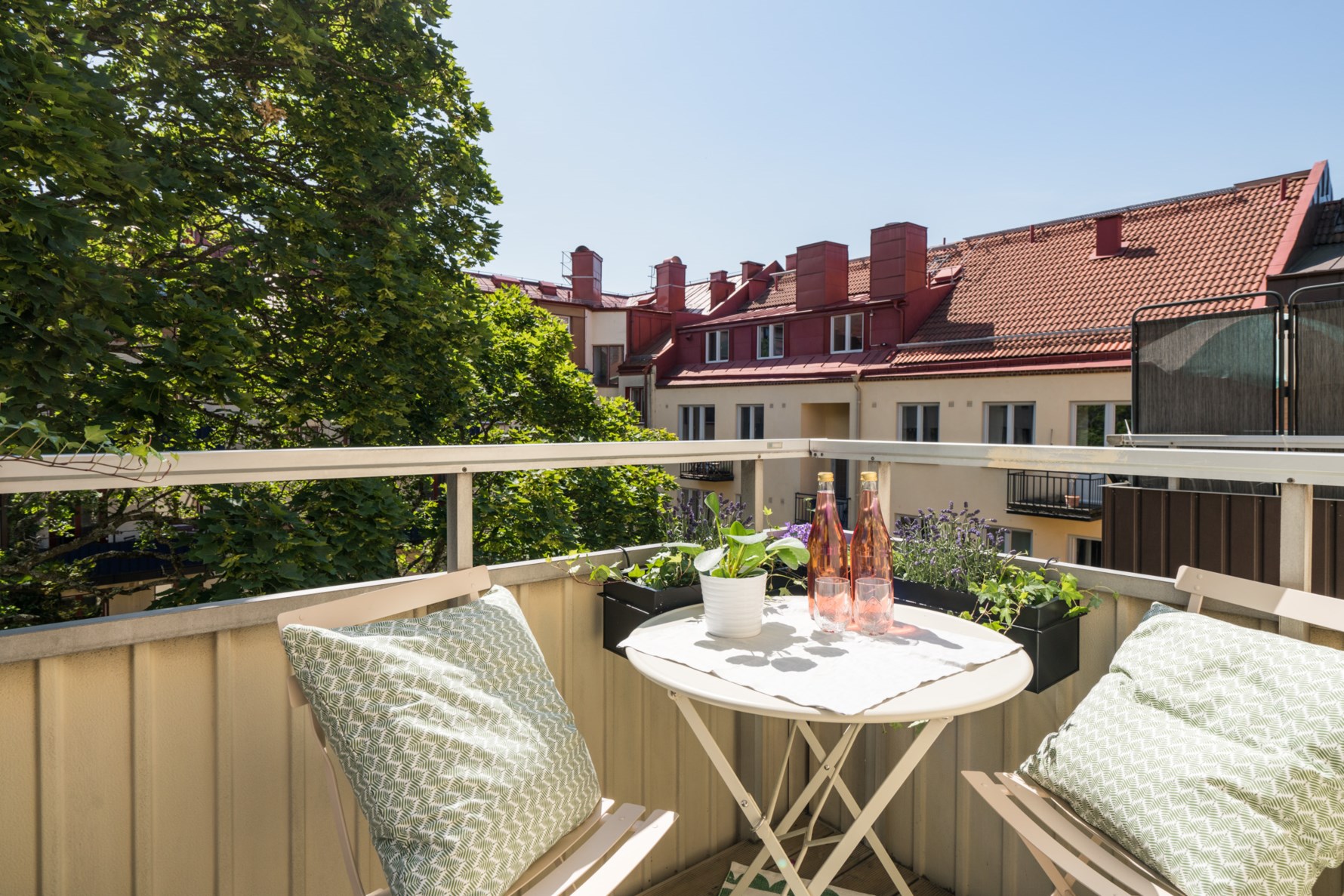 Föreningen erbjuder en fin innergård med altan och sittplatser och grillmöjligheter samt en gemensam takterrass med grill och infravärme.