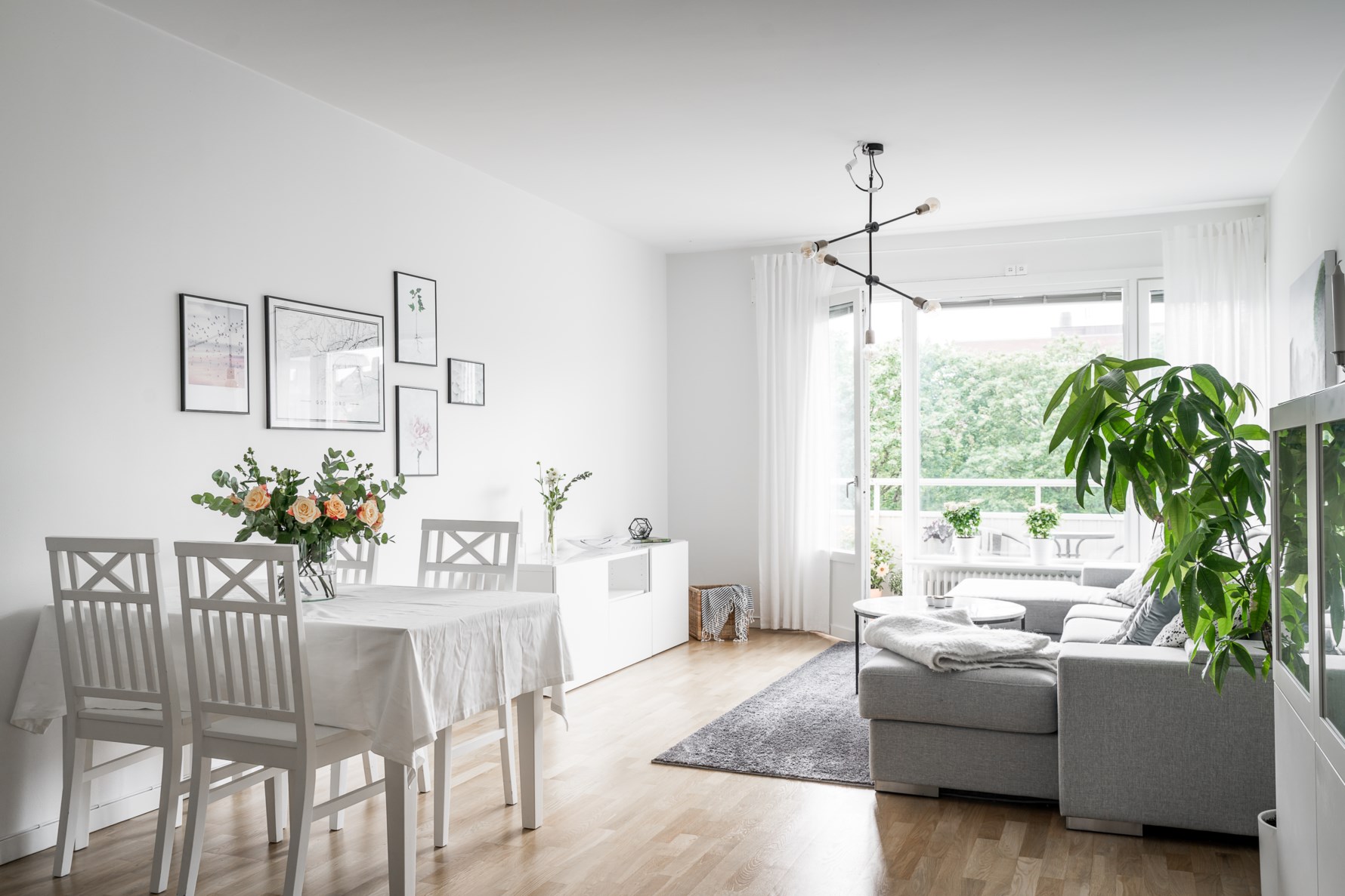 Alla väggar, tak och fönster samt element målades och/eller spacklades. Nytt golv lades in. Du får med enkelhet utrymme för en köksmöbel där hela familjen får plats.