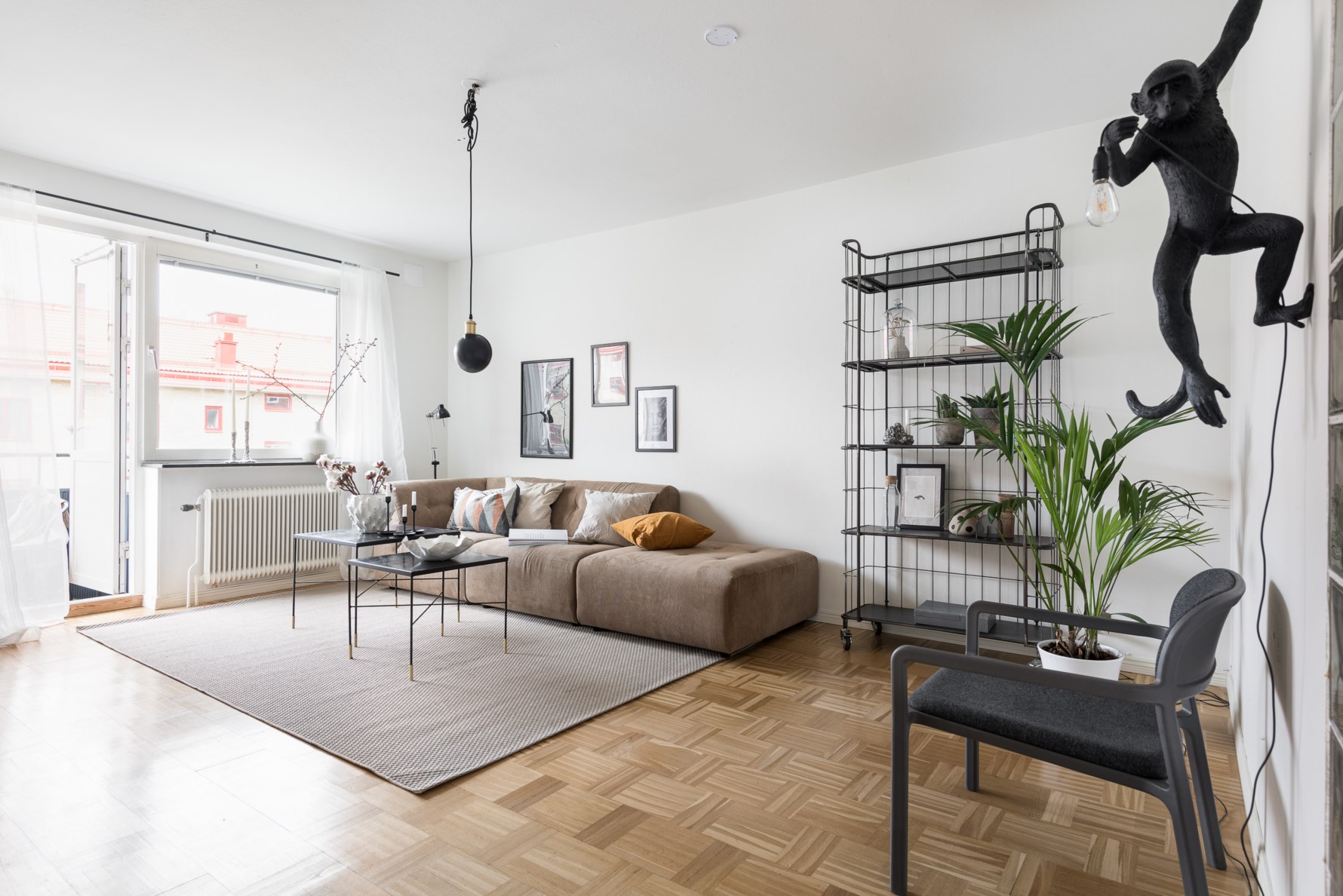 Vardagsrummet är en utmärkt plats för umgänge i goda vänners lag. Stora härliga fönsterpartier tillsammans med balkongdörren bjuder på rikligt med ljus som flödar fritt i rummet. Ni finner olika möbleringsalternativ som inkluderar soffgrupp, bord och tv-möbel. Väggarna är målade i vitt och på golvet återfinner ni det vackra golvet. Från vardagsrummet når ni den härliga balkongen i högt fritt läge med utsikt över omgivningen. Möblerbar med bord och stolar för att kunna sitta ned och njuta av solens strålar.