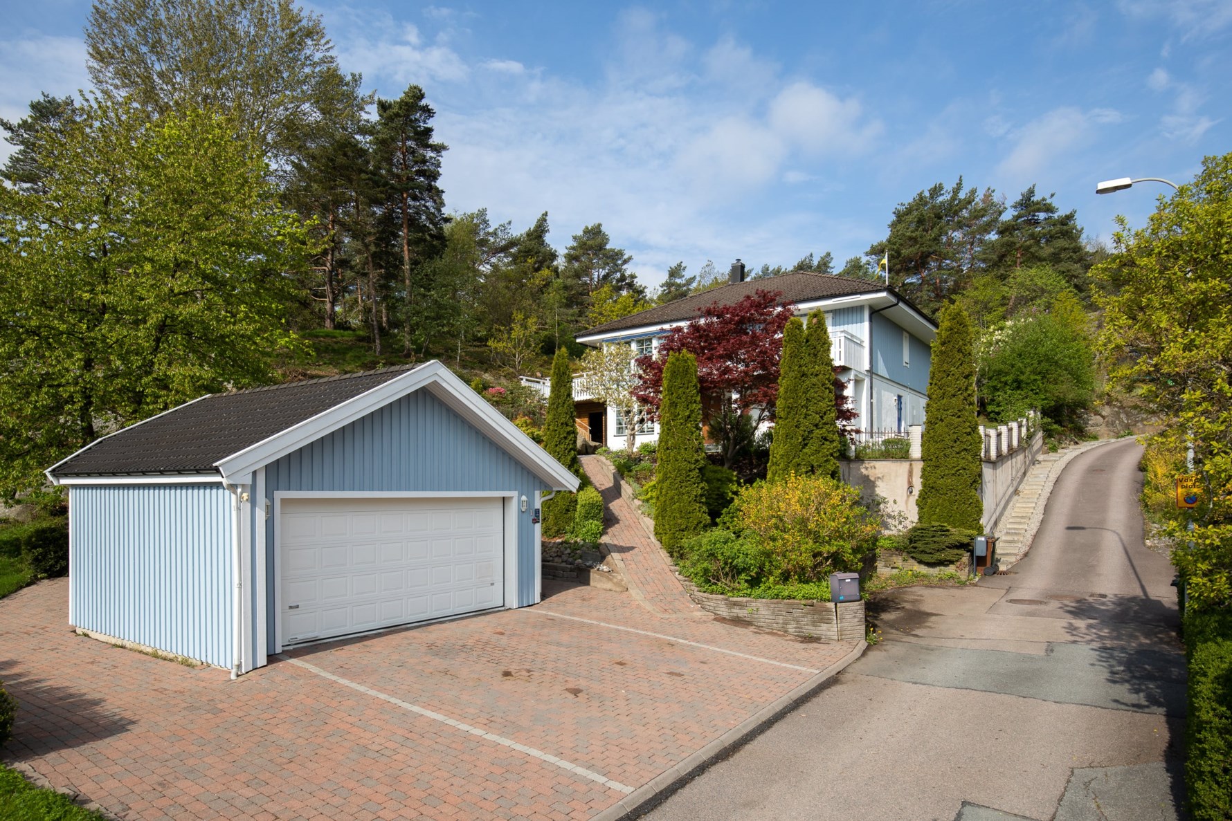 Låt trapporna ta er upp till våning två och ni möts av ett stort allrum där både familj och vänner kan samlas vid större kalas och tillställningar. Stora vackra fönsterpartier med spröjs låter ljuset flöda fritt. Det centrala här är den fina braskaminen, inte bara mysig under höstens mörker utan också en trevlig värmekälla. I allrummet kan ni möblera med en större soffgrupp, bord och tv-möbel samt ett större matsalsbord som tar uppåt 12 gäster. Från denna del av bostaden når ni även den stora balkongen med fri vy över dalen och härligt soligt läge från morgon till strax efter lunch. På baksidan ligger den helt fantastiska uteplatsen/altanen som går runt huset i två väderstreck. Den unika placeringen av tomten ger ett exklusivt läge i området och erbjuder allt en kan önska om man gillar att få vara privat och kunna odla, leka och har en önskan om en lummig och uppvuxen trädgård. Gräsmatta, bärbuskar, fina planteringar, fruktträd och vackra syrénbuskar pryder tomten. Även odlingsmöjligheterna är många - här finns bland annat ett sparrisland. Allmänning och skog omger tomten och det växer blåbärsbuskar uppe på kullen. Här bor man mitt i stan, med känslan av att vara ute på landet. På uteplatsen kan ni ha allt från solsängar till matbord för att kunna sitta ned och njuta under sommarkvällarna.
