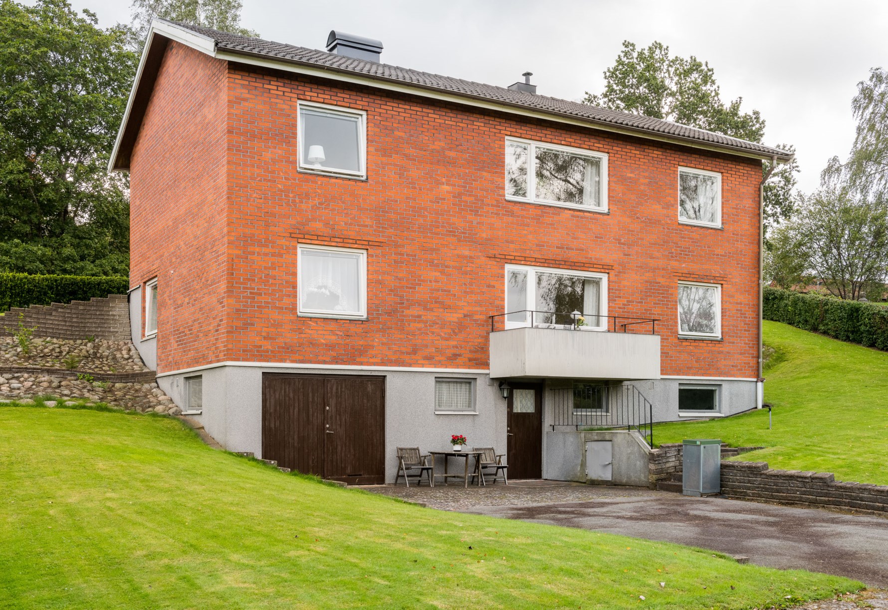 Nedför trappan kommer man till en hall med ingång från nedsidan av huset. Från denna hall nås matkällare, torkrum, pannrum, tvättstuga och hobbyrum.