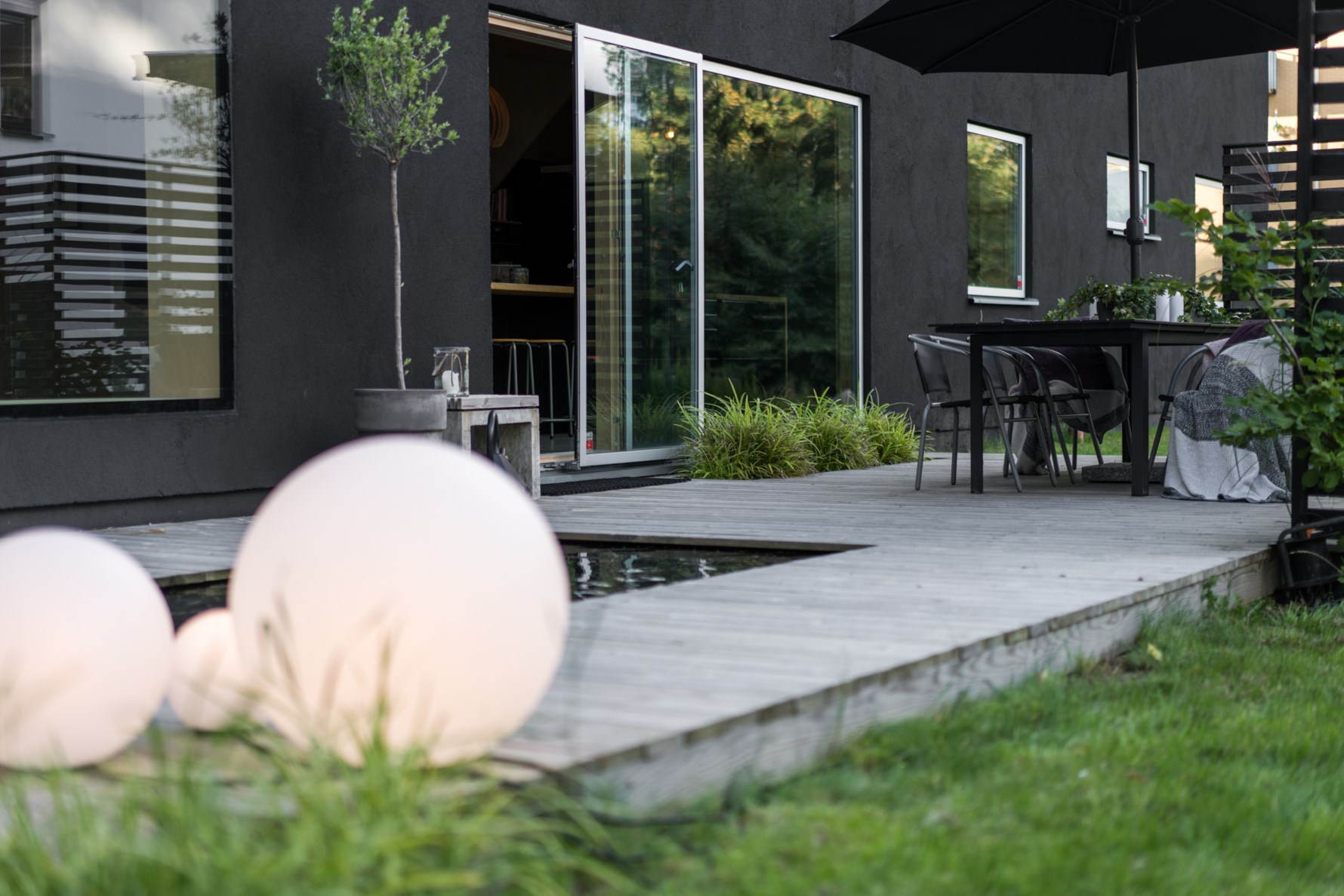 Direkt åtkomst till uteplatsen som sträcker sig som ett U längs tre av de fyra fasaderna. Perfekt frukostställe direkt utanför det stora fönsterpartiet med skjutdörr från Velfac. Skogen och berget på baksidan möter träaltanen. En liten damm med porlande vatten speglar sig i det enorma fönstret som osynligt livar med den svarta putsade fasaden.