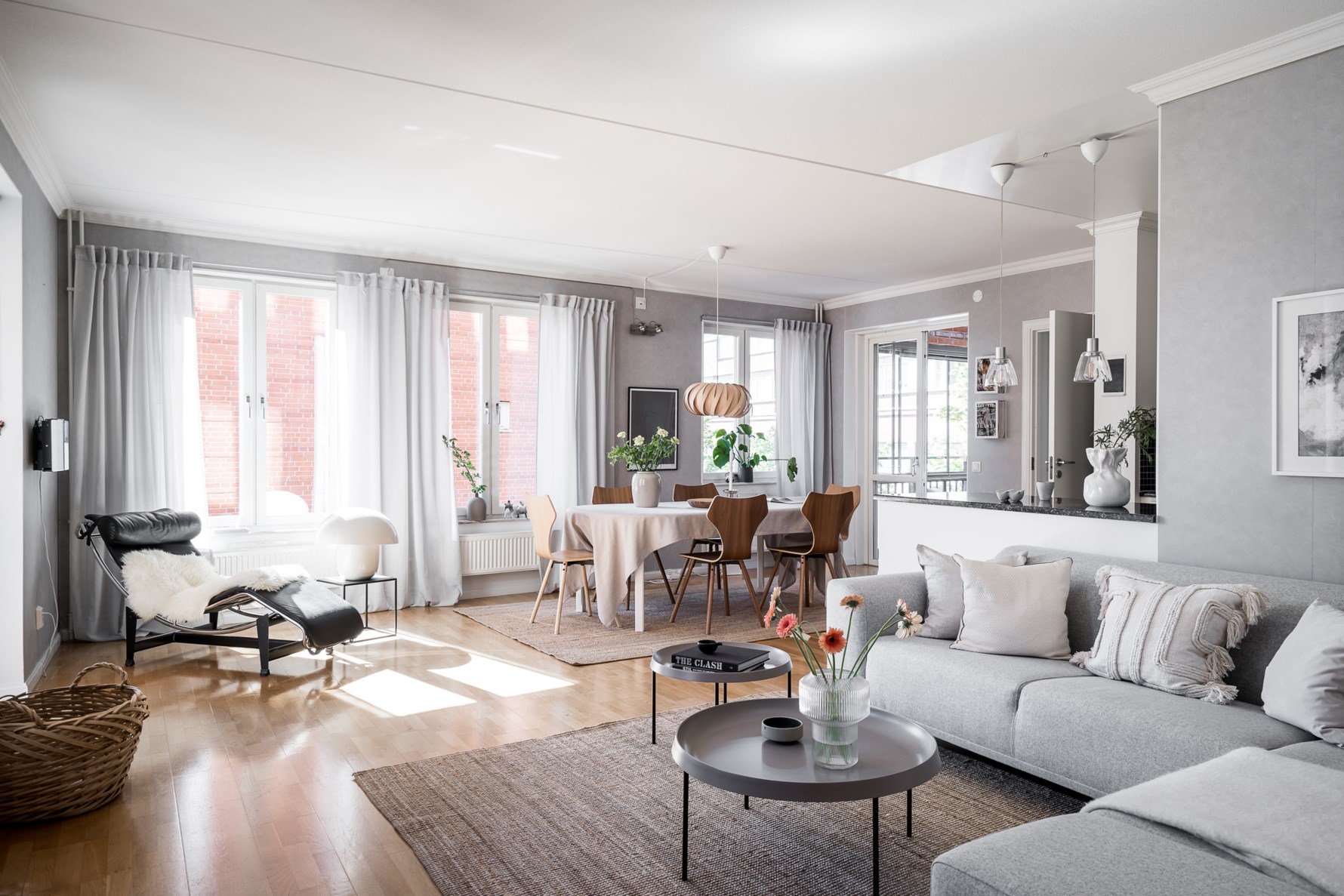 Vardagsrummet bjuder på rikligt med ljusinsläpp genom fönster i tre väderstreck. Den öppna planlösningen mellan kök och vardagsrum bidrar till en härlig känsla av rymd. På golvet ligger en ekparkett och väggarna pryds av en grå tapet.