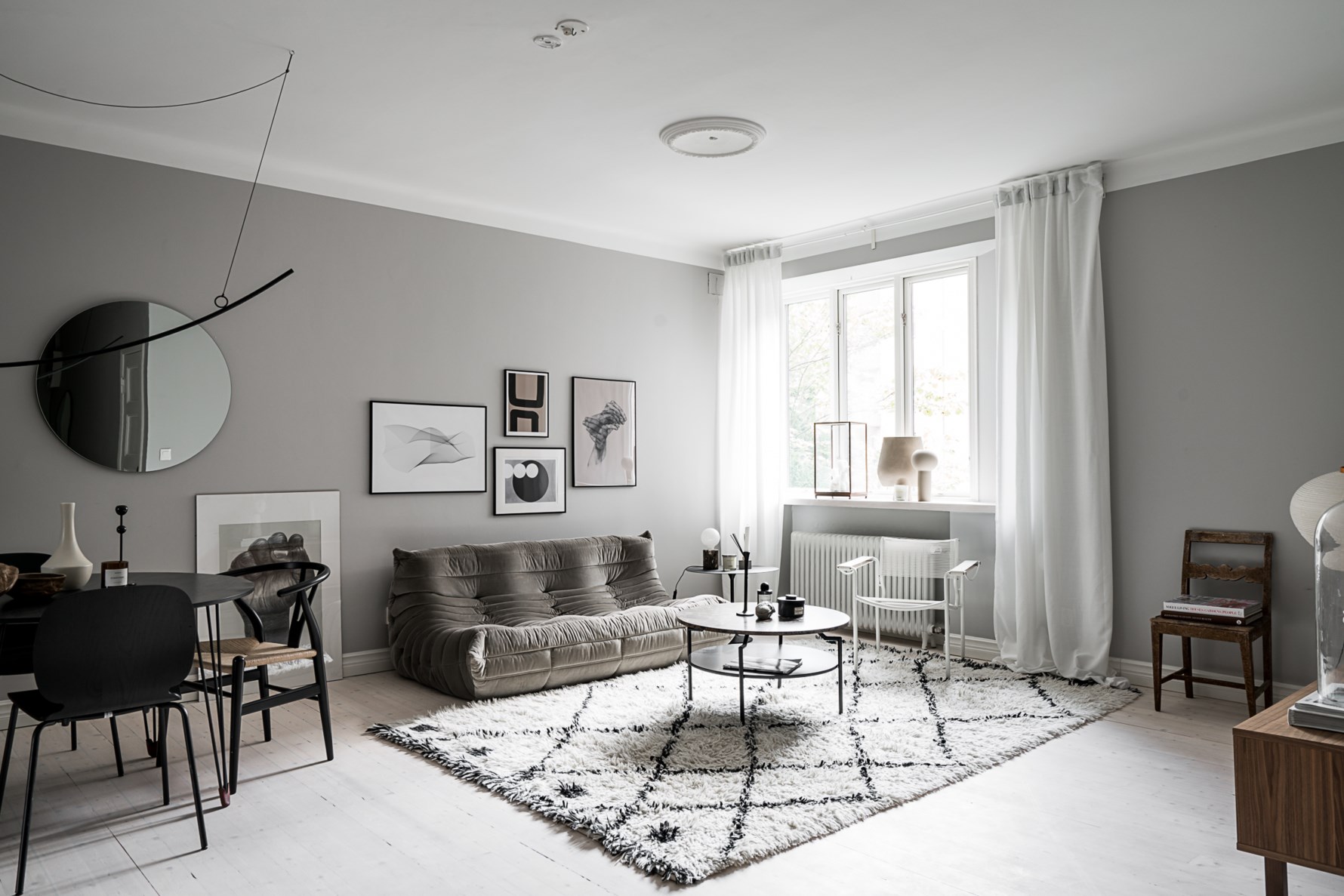 Inne i bostaden möts man av en hall med plats för avhängning och i taket sitter infällda spotlights. Lägenheten har genomgående vitlaserade brädgolv och ljusgråa målade väggar.