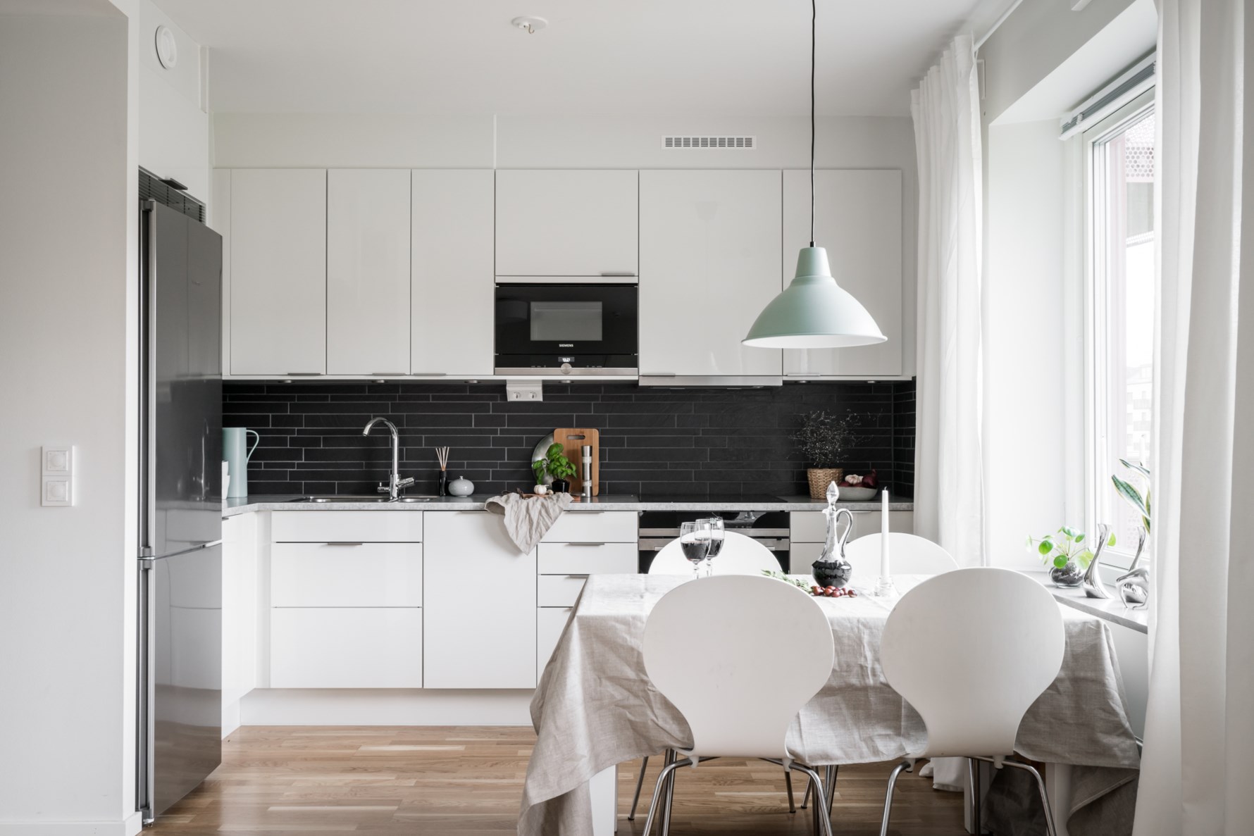 Kök med köksinredning i högblankt vitt från Marbodals serie Vollo vilket är ett extra tillval. Laminatbänkskiva i grå betong och stänkskydd i svart skiffer. Under väggskåpen sitter infällda dimbara spotlights vilket också är ett påkostat tillval. Köket är utrustat med induktionshäll, fläkt, inbyggnadsugn med varmluftsfunktion, inbyggnadsmikro, integrerad diskmaskin samt kombinerad kyl med frys. Samtliga vitvaror kommer från Siemens. Invid fönstret ryms en matplats för fyra till sex personer. Öppen planlösning mot vardagsrummet.