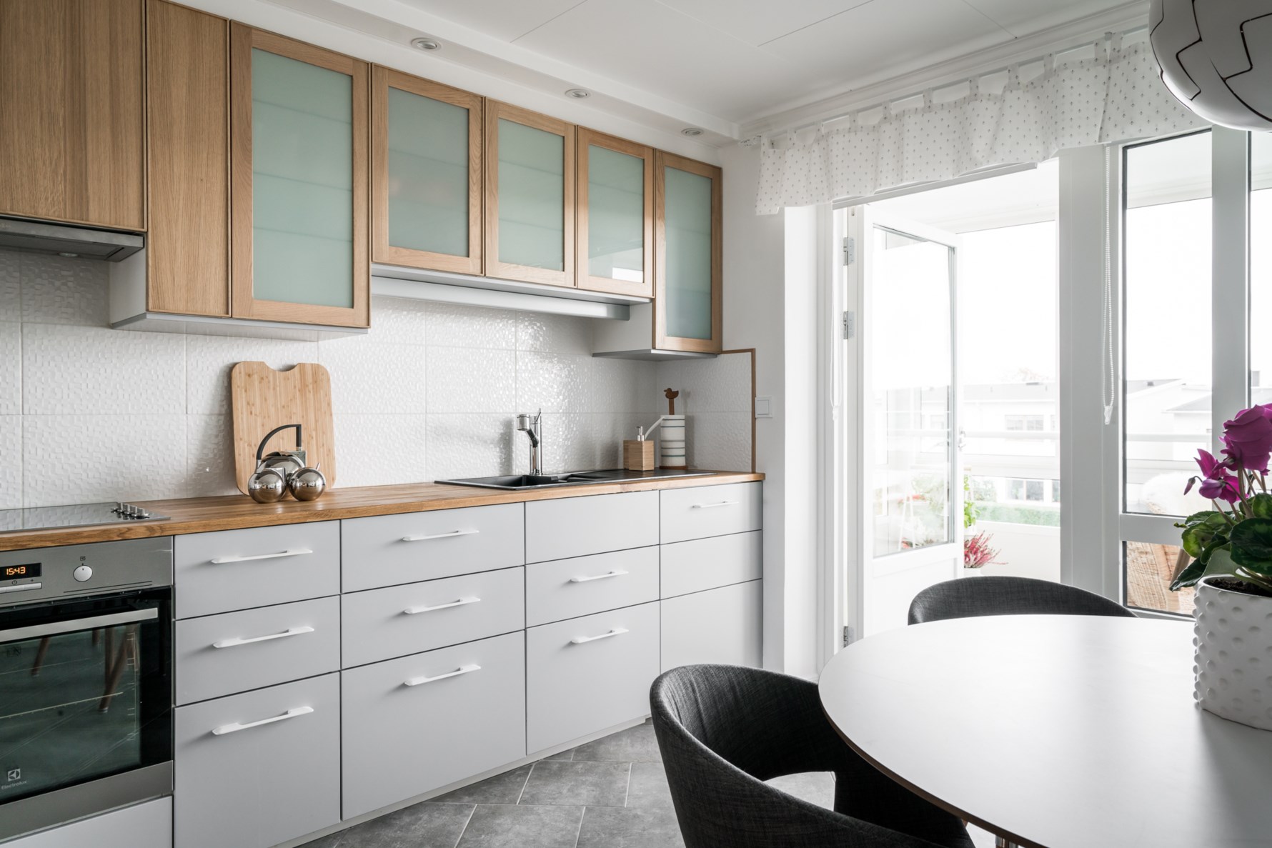 Köksdelen har god förvaring för köksredskapen via både över – och underskåp samt god arbetsyta med bänkskiva i ek. Inredningen går i vitt med släta köksluckor tillsammans med detaljer i ek, handtag i vitt och vitt mosaikkakel på vägg. Den maskinella utrustningen består av spishäll med inbyggd ugn, köksfläkt, diskmaskin samt kyl med frys. I köket har ni även gott om plats för ett större matsalsbord. För extra vardagslyx finns även komfortabel golvvärme i köket. Från denna del av bostaden når ni även den inglasade balkongen, belägen mot morgonsolens strålar. Golvet är nylagt med praktiskt och fint klinker i grått - samma som återfinns i köket. Här kan ni disponera bord och stolar för att sitta ned och njuta. Lamellgardiner är installerade.