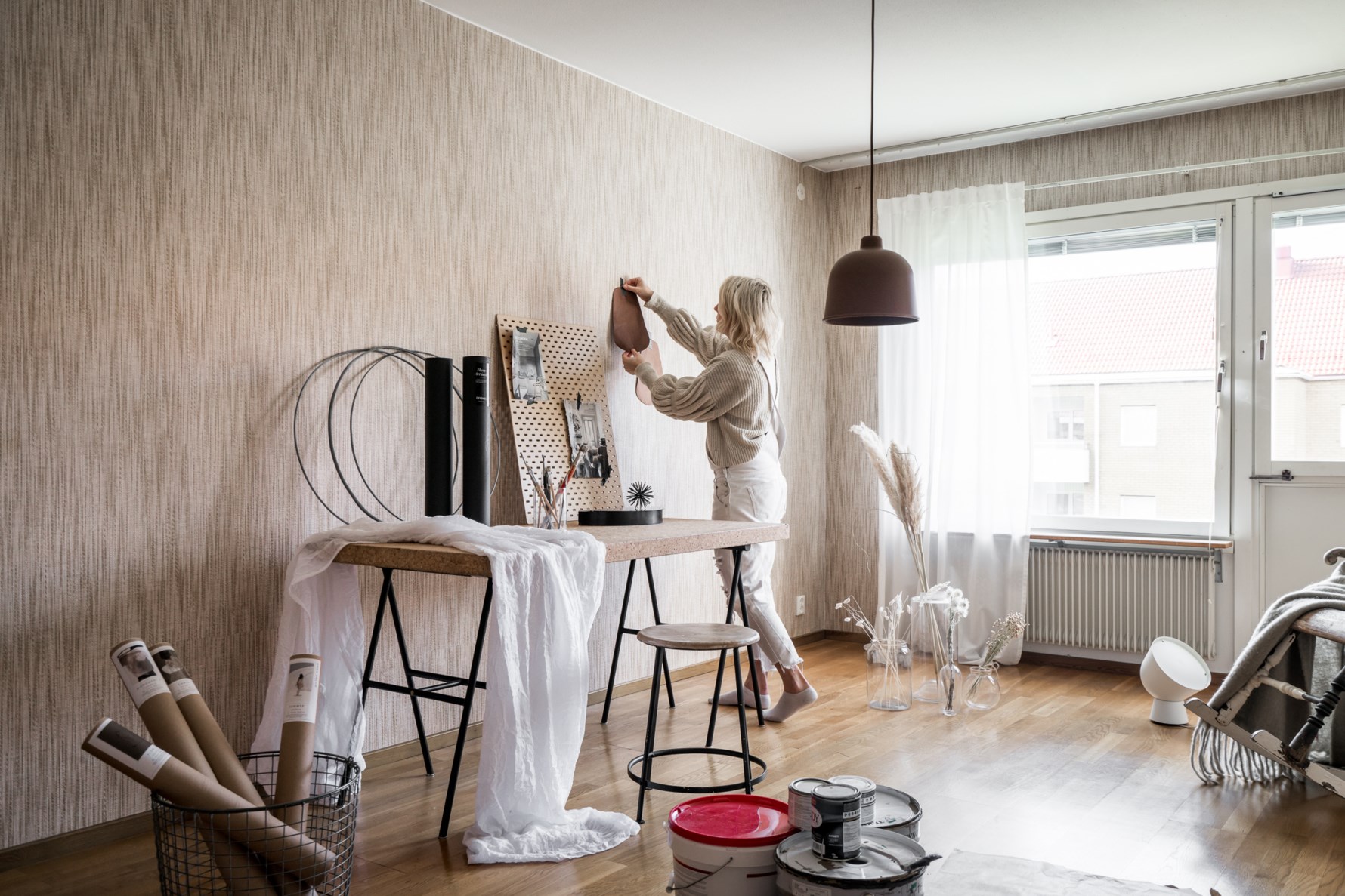 Hall: Välkomnande och rymlig hall med gott om förvaring i form av en lång garderobsvägg som innefattar 5 garderober samt städskåp. På golvet ligger en plastmatta och väggarna pryds av färgglada tapeter. Samtliga rum nås från hallen.
