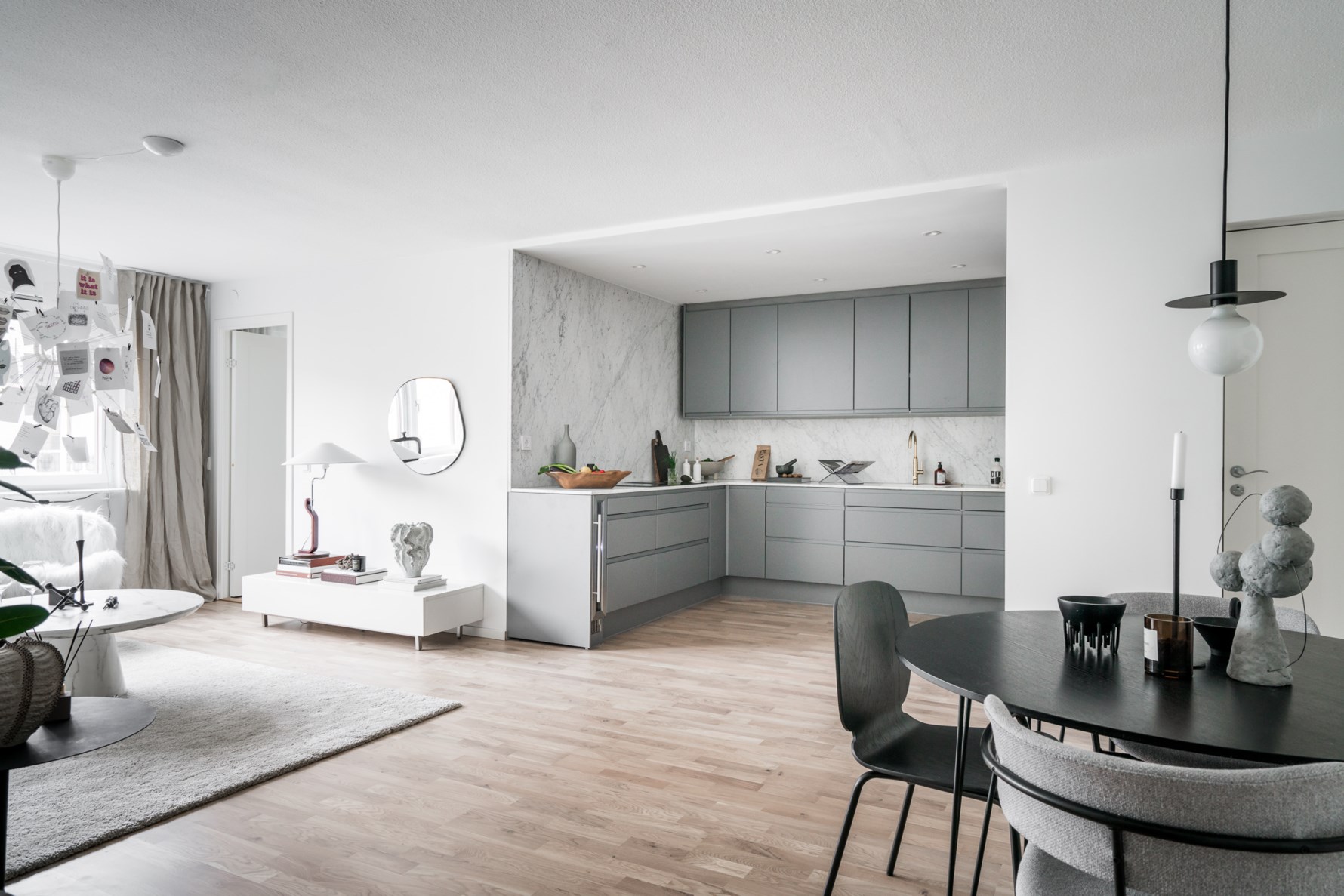 Modernt U-format kök som har köksinredning i grått från HTH med handtagslösa luckor samt både bänkskiva och stänkskydd upp längs hela väggen i carrarramarmor. Nedsänkt vask i vitt med snygg mässingsblandare. Infälld belysning ovan arbetsytorna samt infällda spotlights i taket. Köket är utrustat med extra bred induktionshäll med inbyggd fläkt, inbyggnadsugn med varmluftsfunktion, inbyggnadsmikro, integrerad diskmaskin, vinkyl samt integrerad kyl med frys. Köket är genomtänkt utformat med bra förvaringsmöjligheter och generösa arbetsytor. Kökets disposition har gjorts om från originalritningen för att skapa ett extra sovrum.
