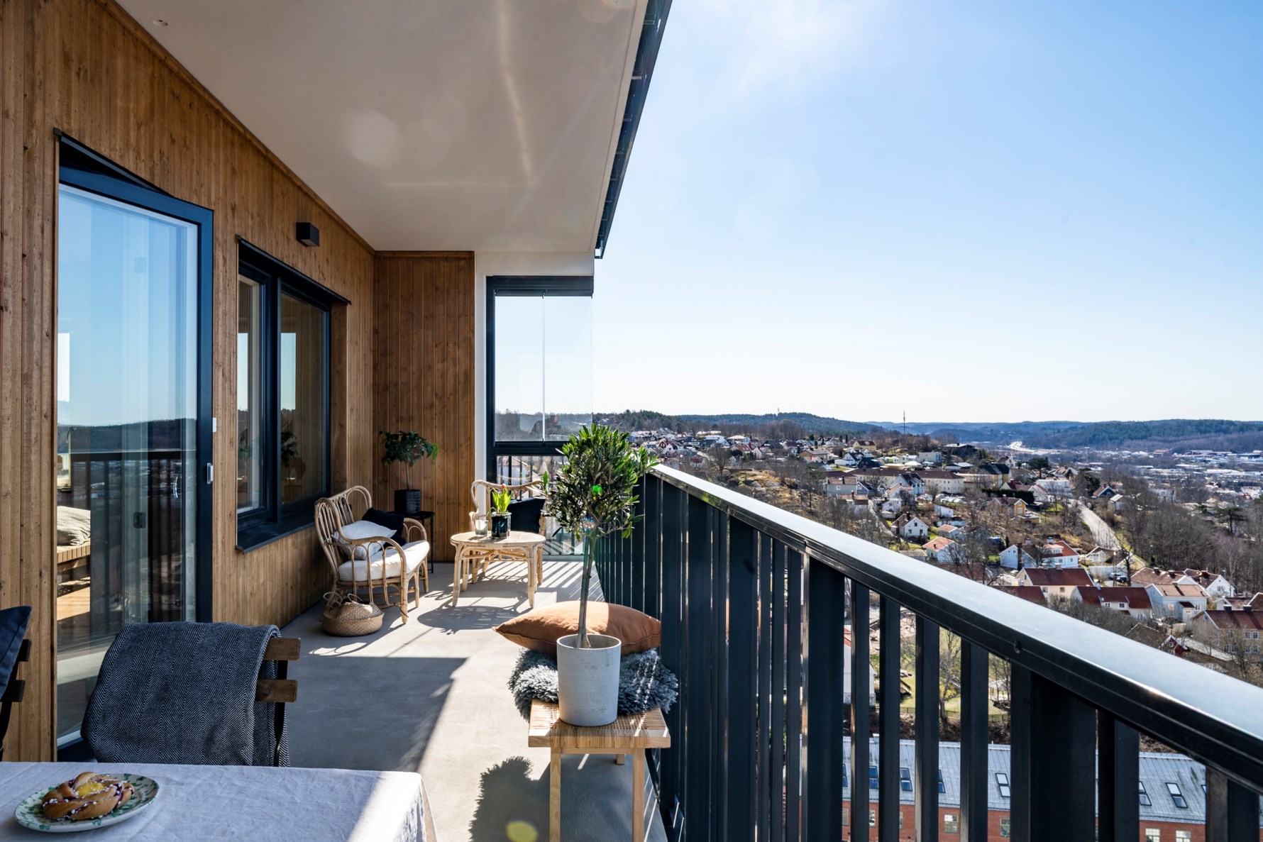 Takterass samt en gårdsterrass med uteträdgård med grill och utemöbler.