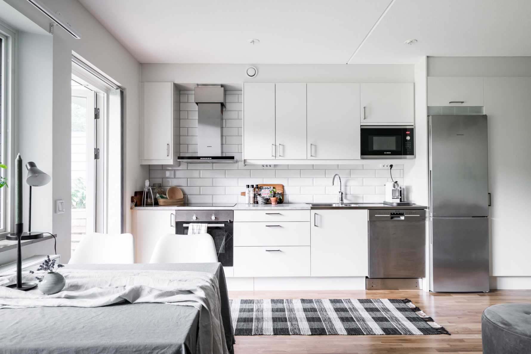 Köket är generöst tilltaget med mycket goda förvaringsmöjligheter för köksredskapen i flertalet över och underskåp. Köksluckorna är vitmålade med vitt kakel och vit/rostfri bänkskiva. Den maskinella utrustningen i rostfritt består av spis med inbyggd ugn samt micro, köksfläkt samt en kombinerad kyl med frys. Vid fönstret invid uteplatsen finns plats för ett matbord för minst fyra gäster att sitta ned. Även här ligger samma parkettgolv i ek som är genomgående i hela bostaden.
