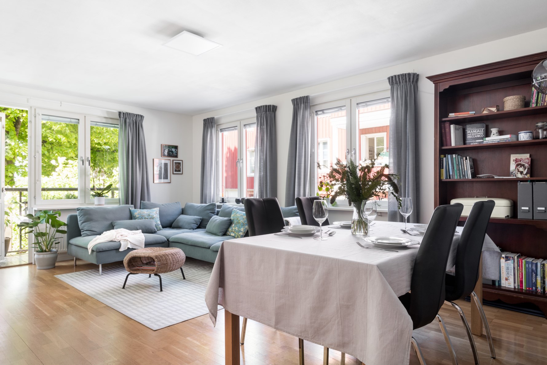 Vardagsrummets ljusa väggar och parkettgolv utgör en bra grund för att sätta sin egen prägel med inredning, konst och textil. Rummet rymmer både matplats och soffgrupp. Fönster i två väderstreck ger utblickar till omgivningen. Från vardagsrummet nås bostadens balkong som är belägen i sydväst. Under sommarhalvåret blir detta den givna platsen för avkopplande stunder.