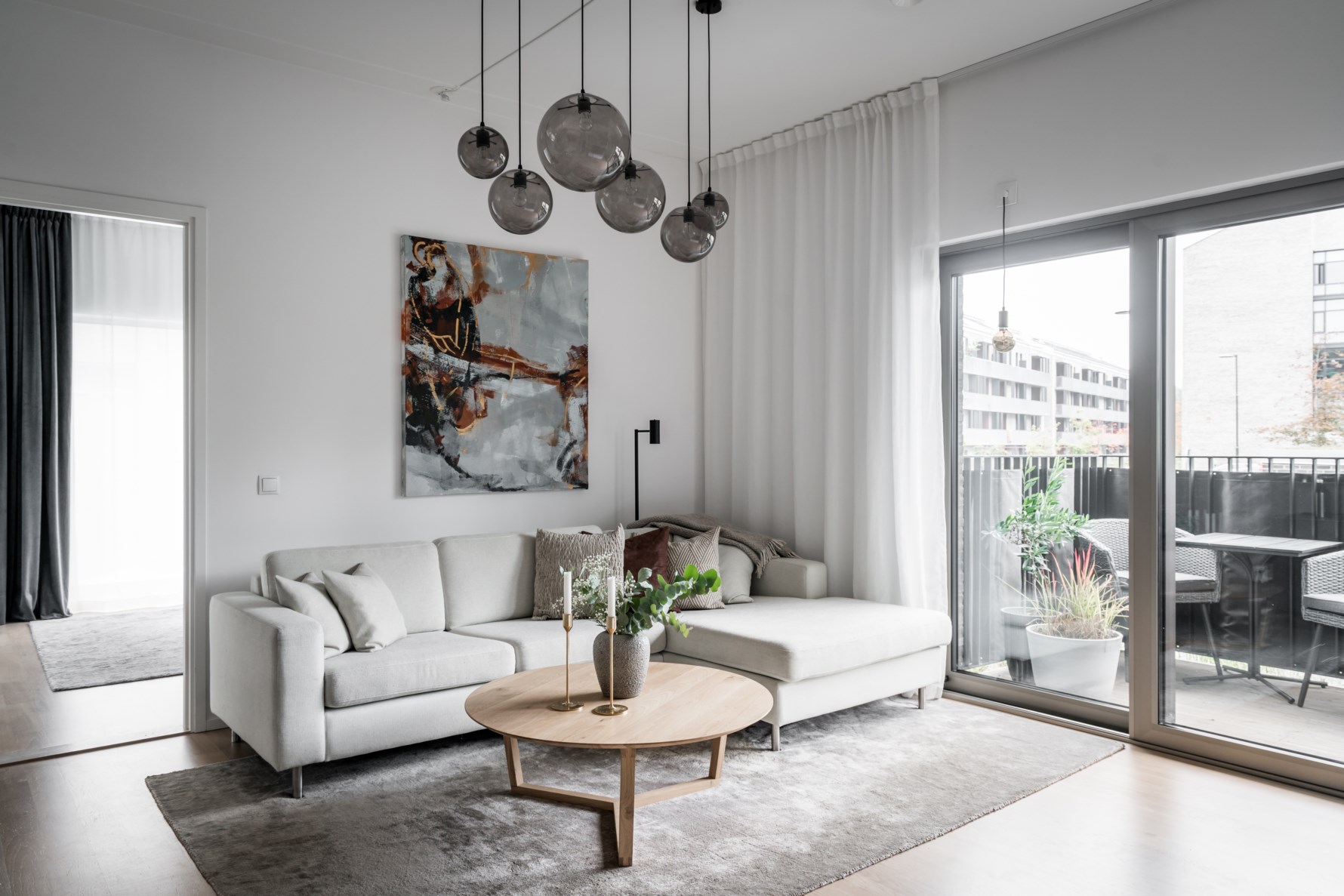 Vidare finner ni kök och vardagsrum i en delvis öppen planlösning som bjuder in till social samvaro och gemenskap. Den fina ekparketten återfinns här tillsammans med vita väggar. Via stora skjutdörrar når ni även bostadens väl tilltagna balkong både från köket samt vardagsrummet.