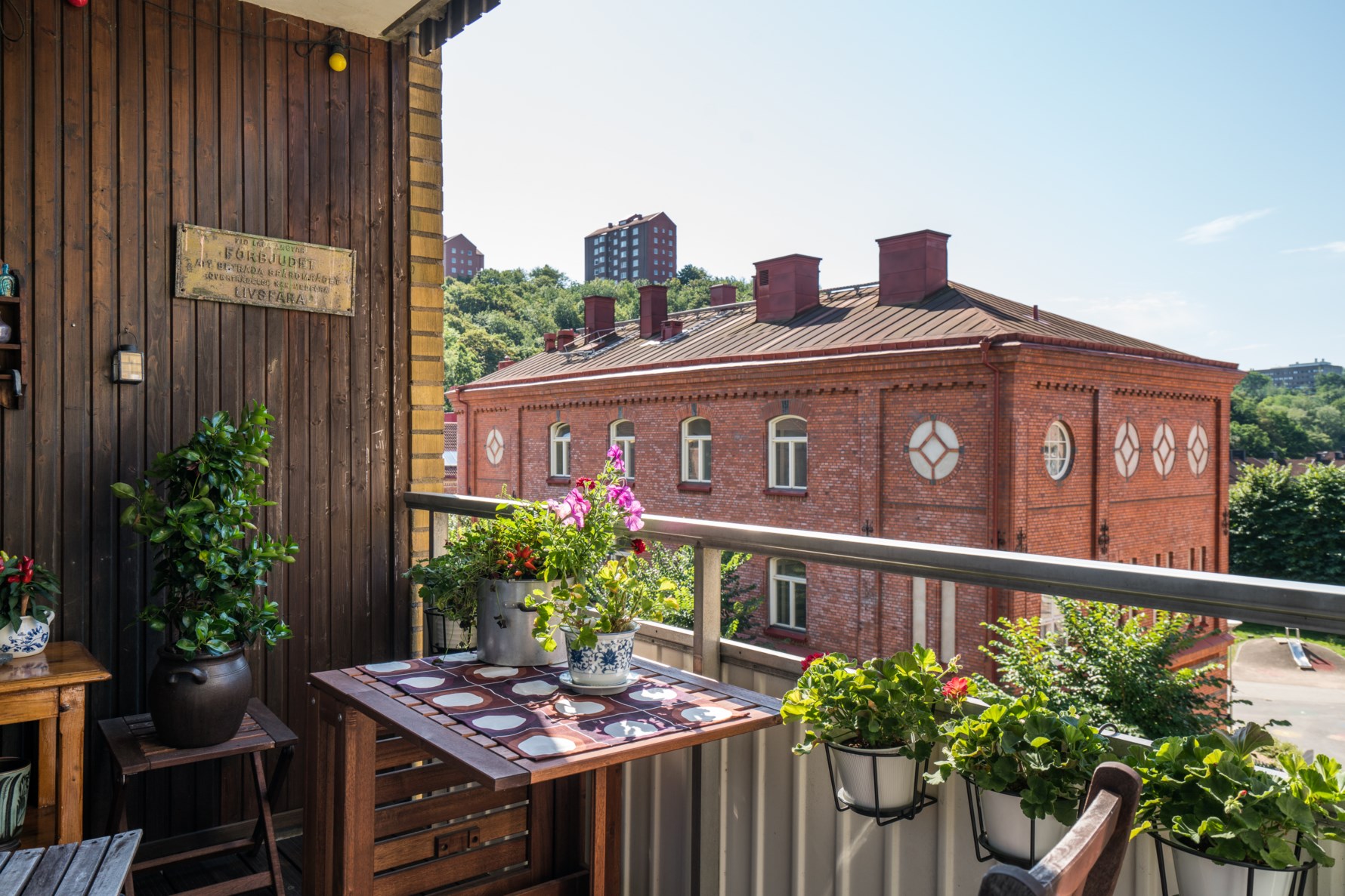På baksidan finns en grön och lummig uteplats med sittmöjligheter och grillplats.