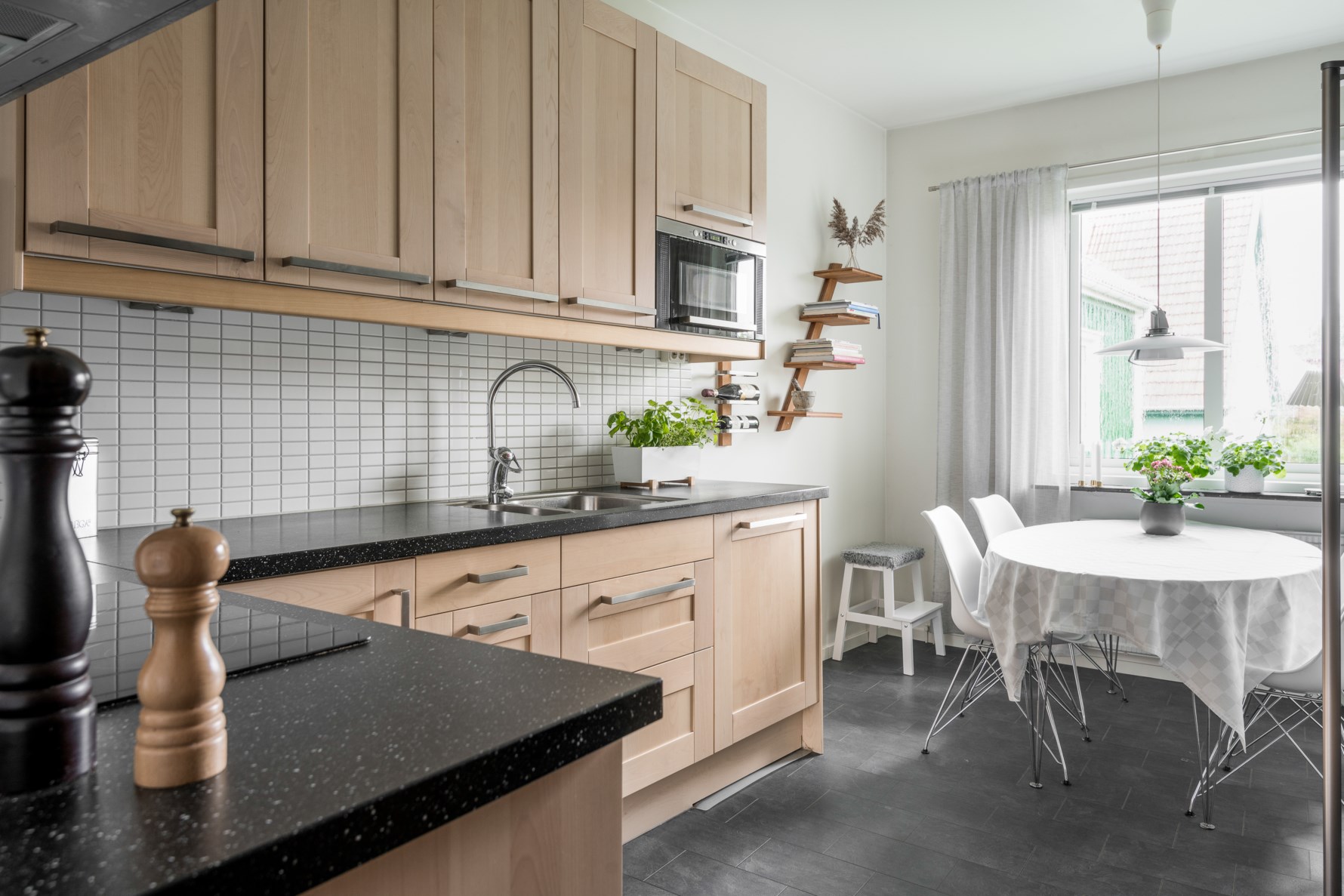 Välplanerat kök med goda förvaringsmöjligheter och bra arbetsytor. Köket har köksinredning i björk som kombineras med svart bänkyta i stenlaminat och stänkskydd i vit mosaik. Köket är utrustat med glaskeramikhäll, fläkt, inbyggnadsung, inbyggnadsmikro, integrerad diskmaskin samt kyl och frys i fullhöjd. Invid fönstret ryms en matplats för fyra till sex personer. Grå klinkerlaminat och vita väggar.