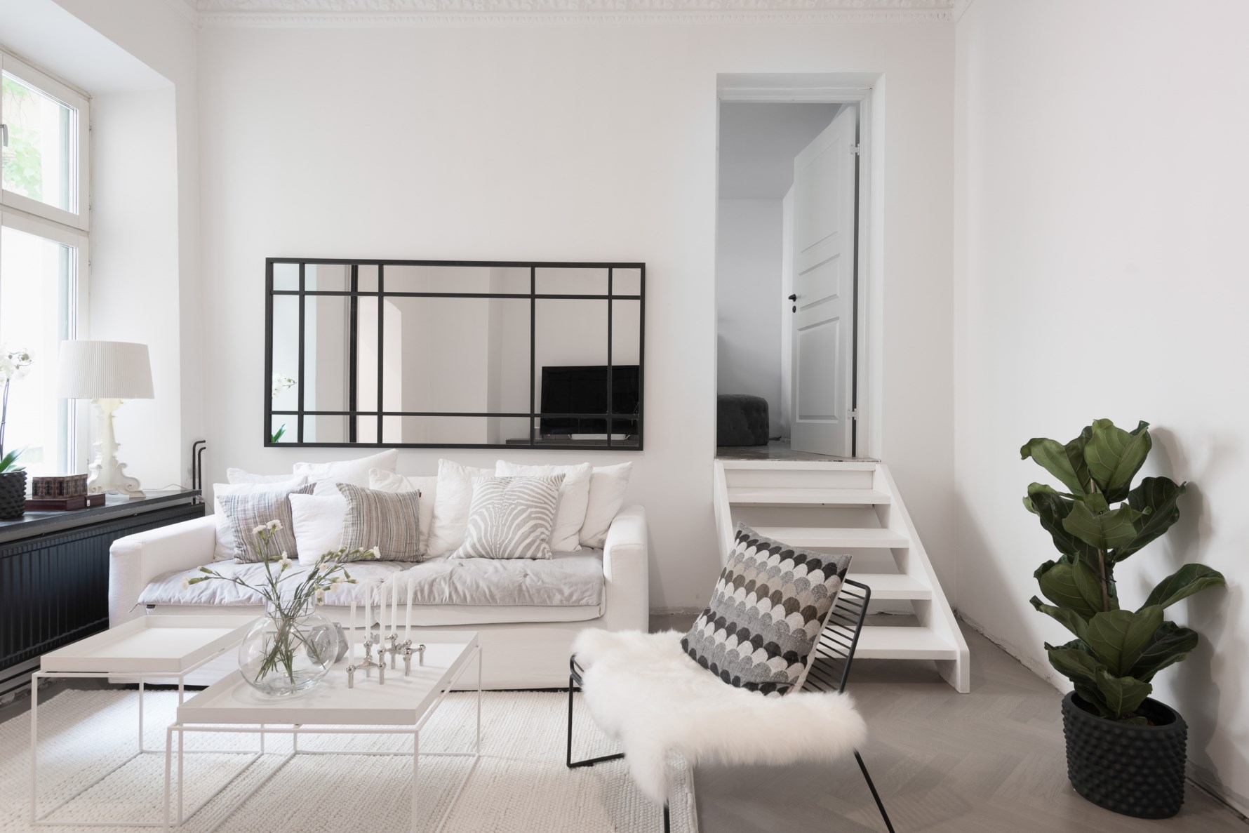 Vardagsrummet stoltserar med generös takhöjd, vacker nylagd fiskbensparkett, stuckatur och takrosett. Här kan man inreda med soffhörna och övrigt möblemang. Ett högt dubbelfönster med djup nisch bidrar med ljusinsläpp.