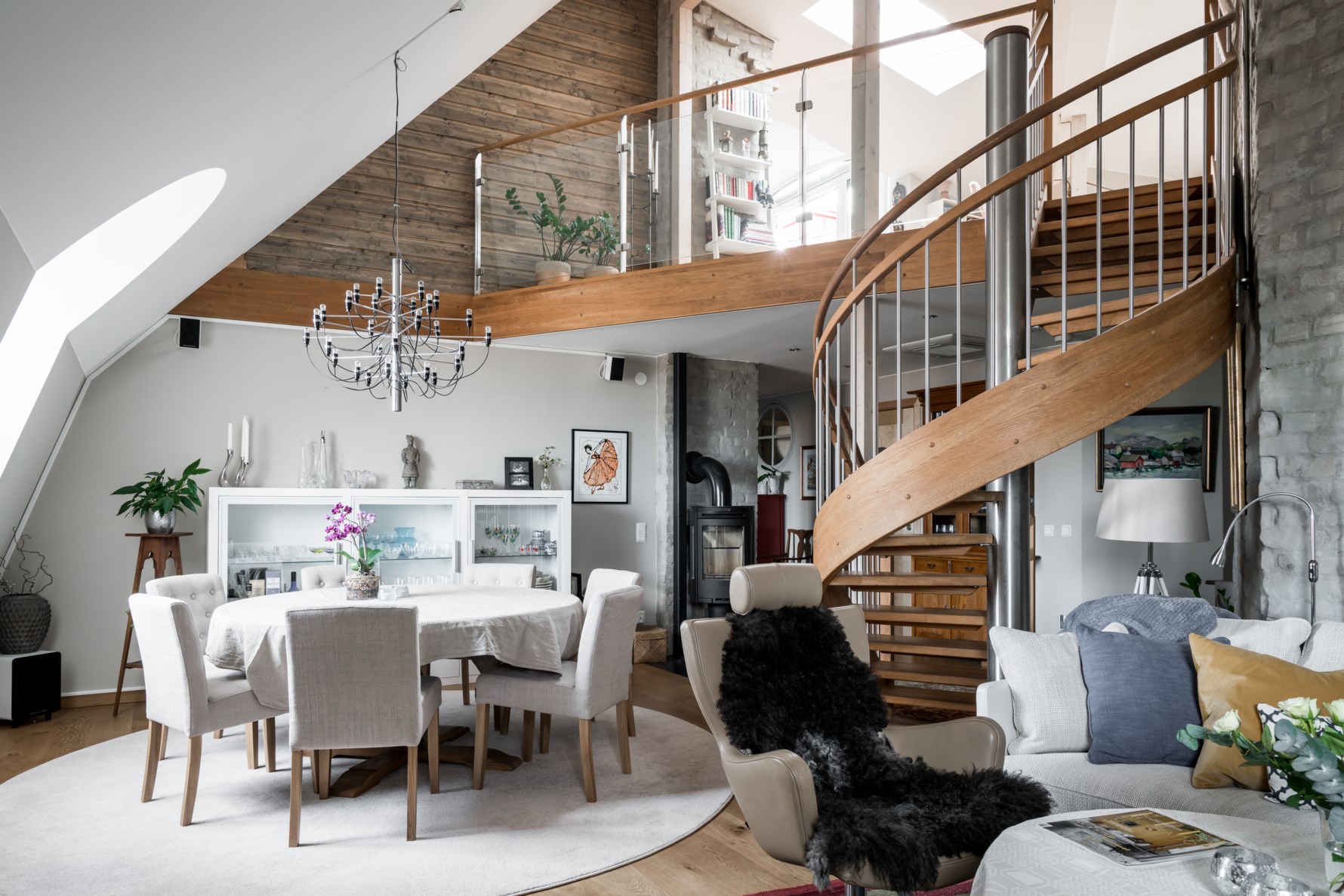 Härliga öppna sällskapsytor som kan inredas med en soffgrupp och matsalsbord för stora middagssällskap. En braskamin bidrar med värme och hög mysfaktor. Fint ljusinsläpp från flera fönsterpartier och snedtak upp i nock. Golvet kläs av ekparkett och väggarna är målade i ljusa toner samt har en karaktäristisk tegelvägg.
