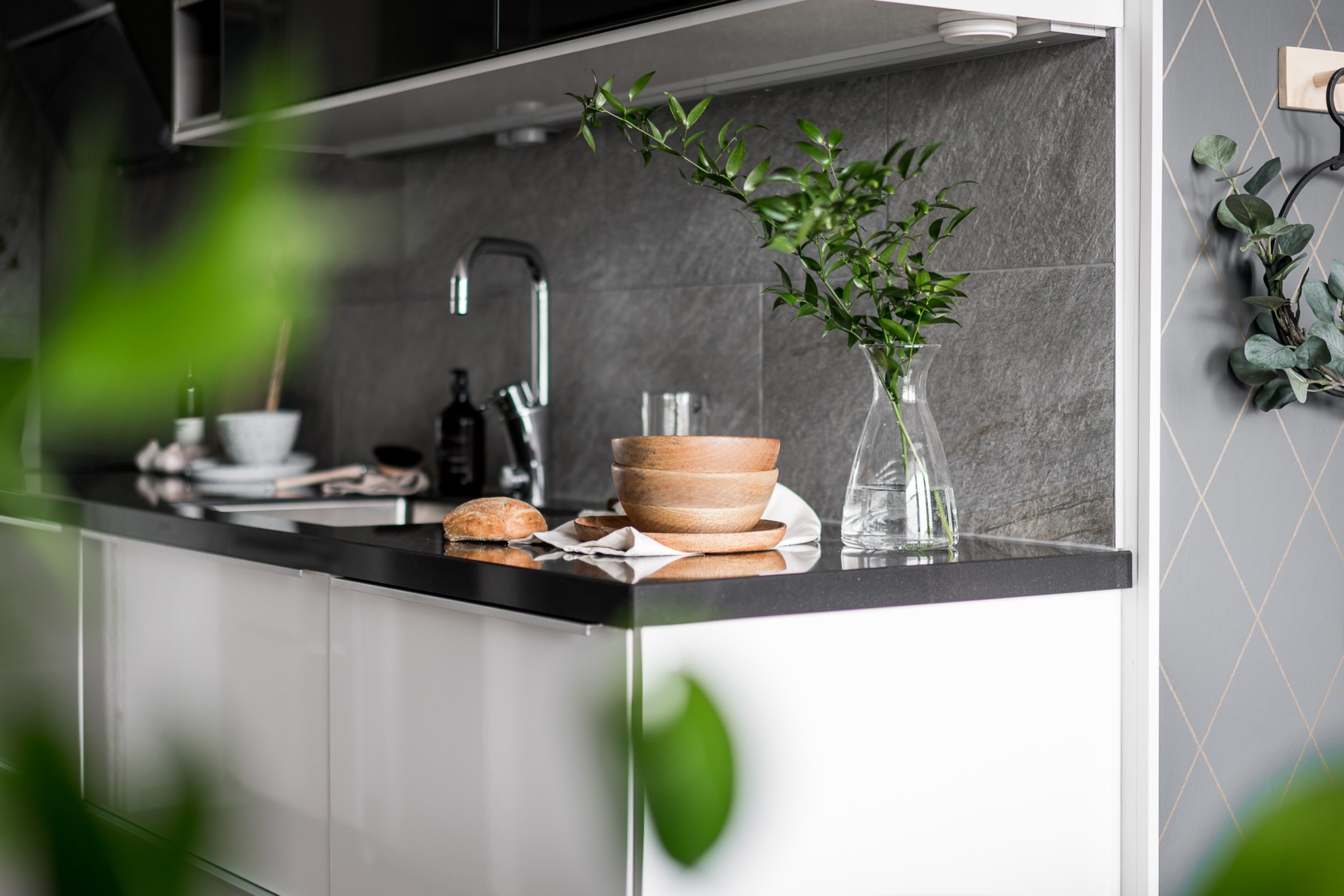 Det stilrena köket har en mysig matplats invid fönstret ut mot balkongen och entrésidan. Här finns gott om förvaringsmöjligheter och arbetsvänliga ytor. Skåpsluckor i högblankt vitt, bänkskivor i svart sten med översittande stora grafitgrå kakelplattor ger ett läckert intryck. Maskinparken i rostfritt består av inbyggnadsugn och mikro, induktionshäll, spisfläkt, diskmaskin, samt kyl och frys i fullhöjd. Från köket nås tvättstugan samt föräldrasovrummet.