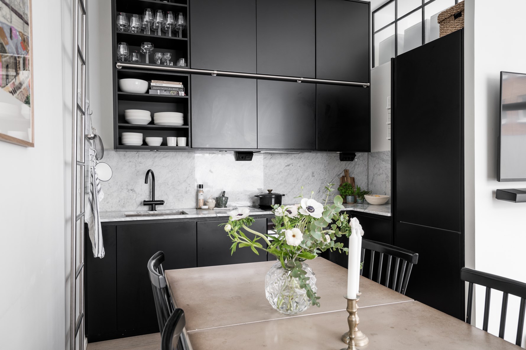 Vidare in i allrummet möts man av stora ytor vilket även här täcks väggarna av de stora fönsterpartierna som ger en ljus och öppen känsla. Golvet kläs av ljus parkett. Gavelläget i bostaden gör så att man kan möblera bostaden på olika sätt med soffgrupp samt även matsalsbord och tv-möbler. Rummet präglas av industrifönster ovanför garderoberna. Köket hör ihop med den öppna planlösningen som är signerat av danska Kvik. Kökets snickerier går i stilrent svart med en matt finish. Den höga takhöjden har tagits tillvara med luckor ända upp. Förvaringen i skåpen hanteras på bästa sätt med den specialbeställda stegen i rostfritt stål. Arbetsytor samt stänkskyddet är i marmor från italienska Carrara, detta ger en elegant brytning mot de svarta luckorna och blandaren från Tapwell. Kökets vitvaror kommer från det välberömda märket Siemens och består av kyl/frys, inbyggnadsugn, induktionshäll, kolfilterfläkt samt integrerad diskmaskin.