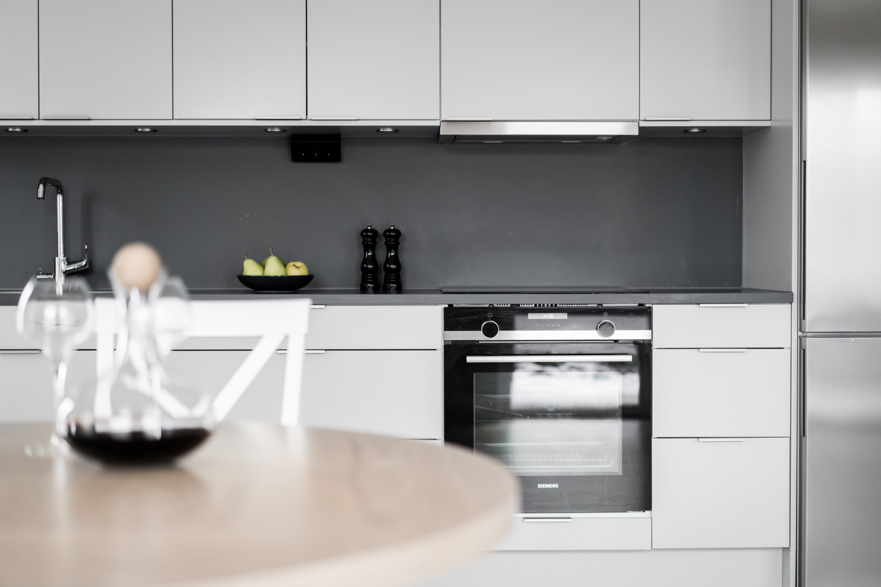 Vardagsrum och köksdelen går i en öppen härlig planlösning, där man valt ett modernt kök med mörkgråa detaljer - Trend heter den övergripande stilen på lägenheten. Lister går i en mörkare ton och väggarna har en varmare nyans. Köket är optimalt planerat med goda förvaringsmöjligheter. Den maskinella utrustningen består av spishäll, inbyggd ugn, inbyggd mikro, diskmaskin och en kombinerad kyl med frys. I rummet finner ni plats för olika möbleringsalternativ som inkluderar soffa, bord, tv – möbel och ett matbord för många gäster.
