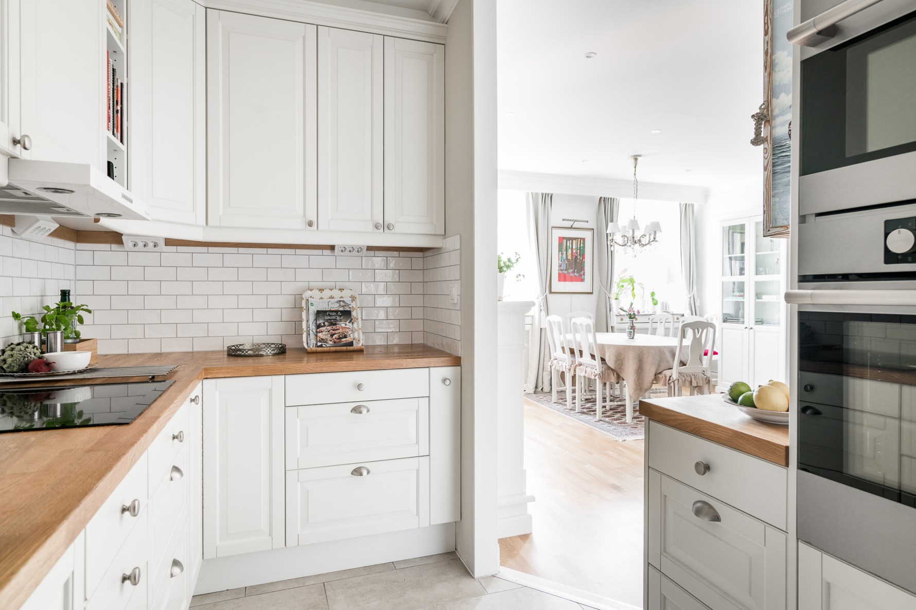 Från vardagsrummet nås köket som är renoverat 2016 med köksinredning i vitt från Epoq, bänkskiva i massiv ek och stänkskydd i vitt kakel. Här finns gott om förvaringsmöjligheter och bra arbetsytor. Den maskinella utrustningen utgörs av induktionshäll från Witt, inbyggd varmluftsugn, inbyggd kombinerad ugn/mikro och integrerad diskmaskin från Asko, frånluftsfläkt från Electrolux samt kyl med frys från LG. Samtliga vitvaror installerades 2016. Ljust klinkergolv och väggar i en beige ton med en tegelmönstrad tapet.