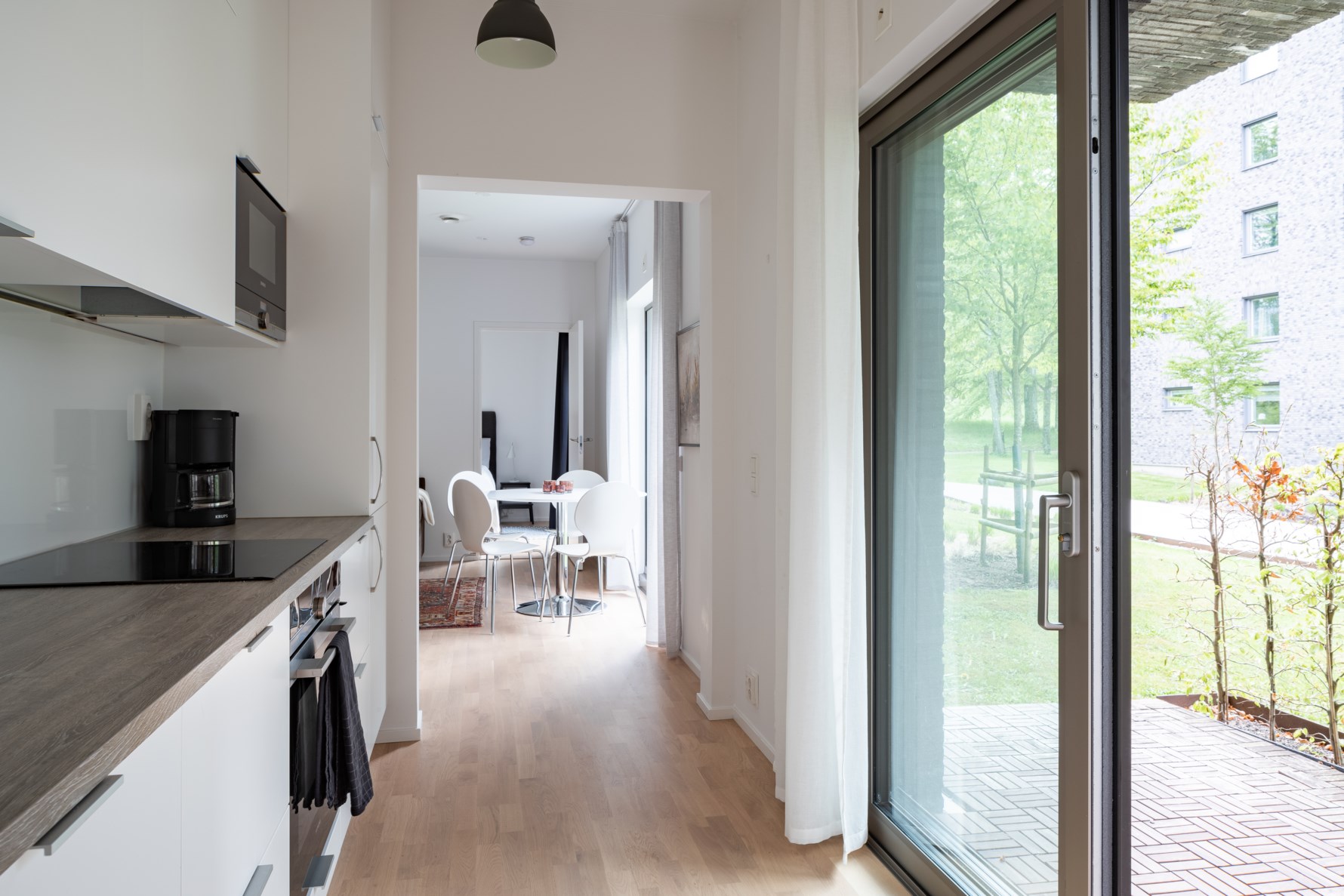 Modernt kök med köksinredning i vitt från Marbodal, laminatbänkskiva i drivved samt vit högblank skiva som stänkskydd. Köket erbjuder bra arbetsytor och gott om förvaring. Den maskinella utrustningen består av induktionshäll, fläkt, inbyggnadsugn med varmluftsfunktion, inbyggnadsmikro, integrerad diskmaskin samt integrerad kyl med frys. Stora öppningsbara fönsterpartier ut till uteplatsen som ligger i soligt sydvästläge. Uteplatsen har trätrall och en häck för insynsskydd.