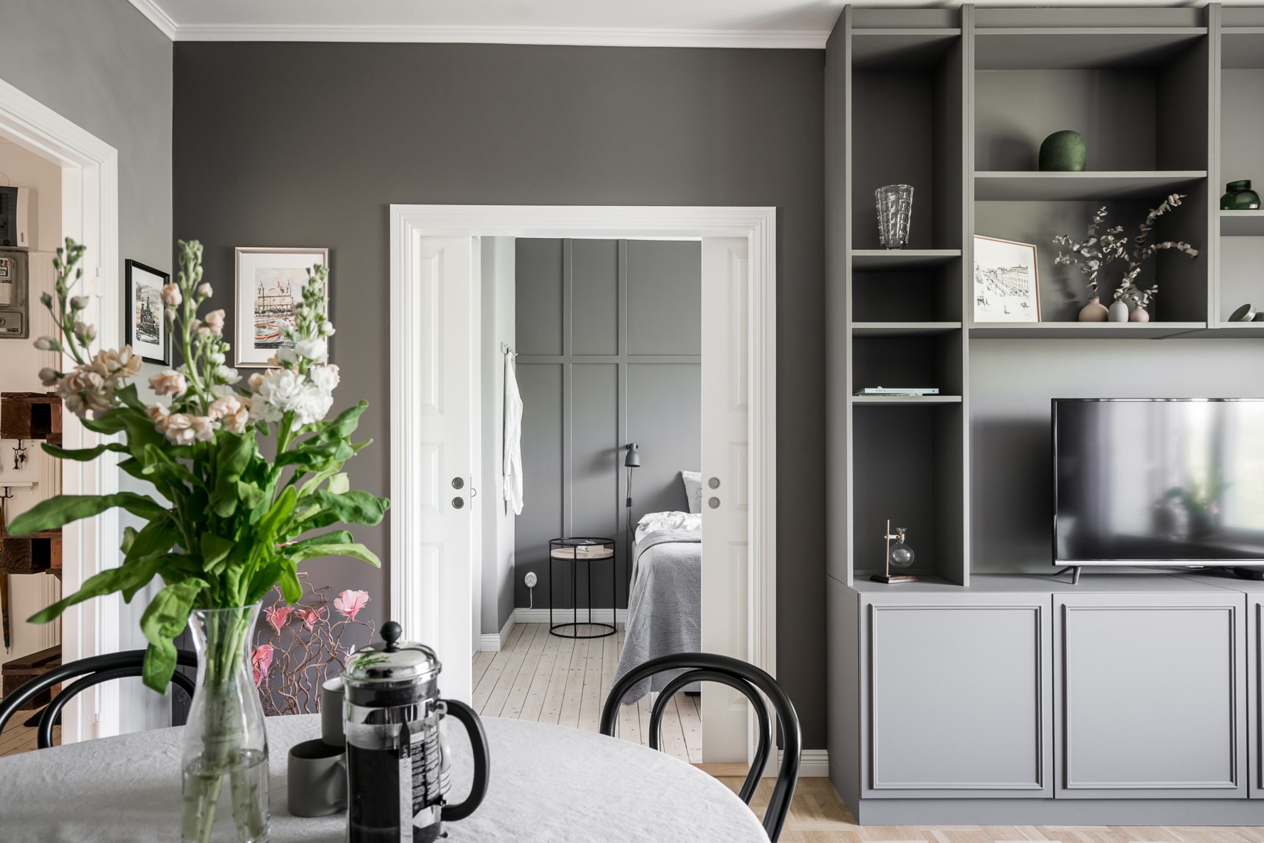 Vardagsrummet som nås från hallen får fint ljusinsläpp tack vare fönsterpartiet i västerläge. Här fås plats med soffgrupp med tillhörande möblering samt matsalsbord om så önskas. Väggarna är här målade i en behaglig grå ton där man också passat på att måla in en platsbyggd hylla som inte bara är oerhört snygg utan även praktisk då den sväljer både en tv och erbjuder en hel del förvaring. Golvet täcks av ett parkettgolv i original lagt i holländsk läggning.