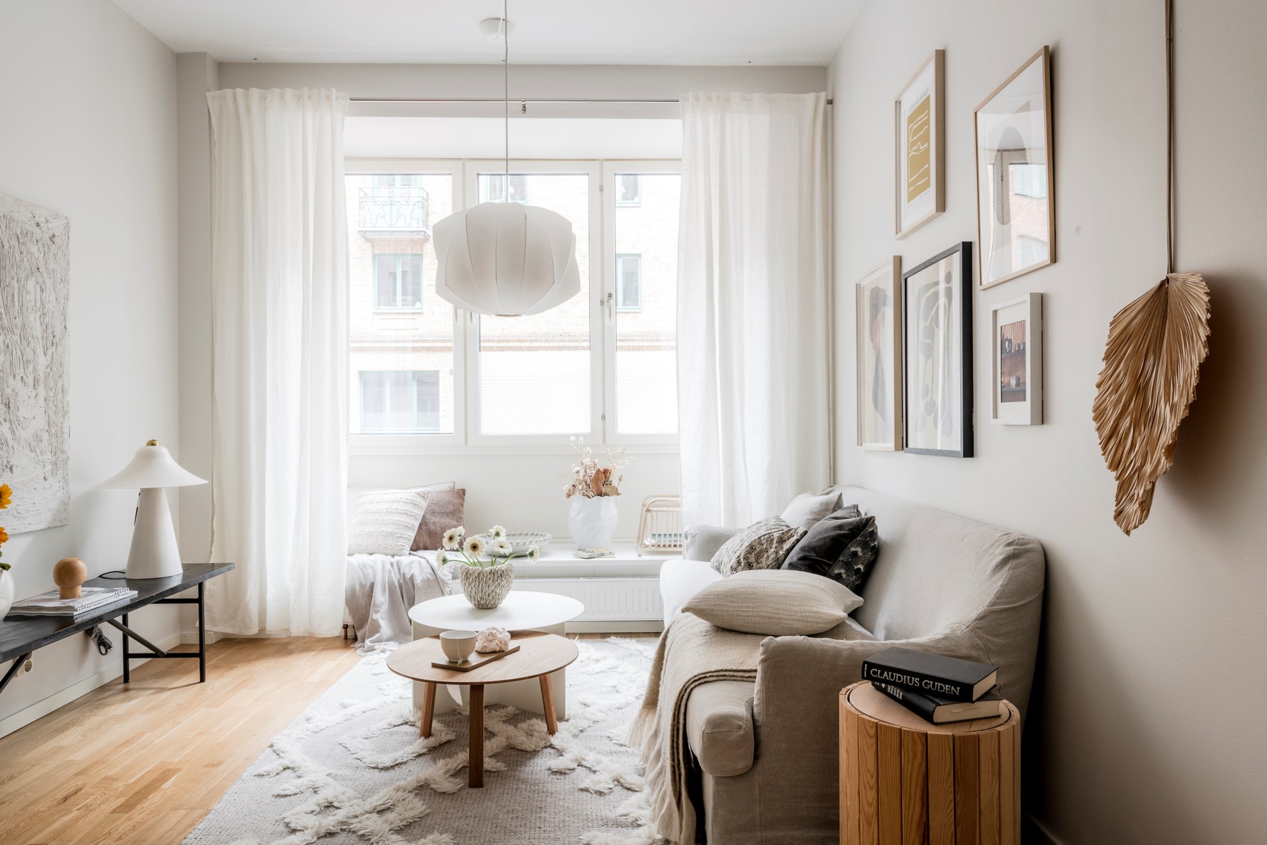 Innanför den egna entrén välkomnas ni av en mindre hall med plats för avhängning samt förvaring i en rejäl garderob. Därefter möts ni direkt av bostadens kök från 2010 som går i tidlösa färg- och materialval. Köksluckor i vitt, bänkskiva i ek samt vitt kakel som täcker väggpartiet ovan. Köket är utrustat med induktionshäll från 2021, varmluftsugn, kolfilterfläkt, diskmaskin samt ett kylskåp i svart från Smeg. Här fås ett fönster med djup fönsterbräda ut mot den lummiga innergården. Golvet täcks av en trestavsparkett i ek som också är genomgående för hela lägenheten och väggarna är genomgående målade i färgen Sommarsnö från Jotun.