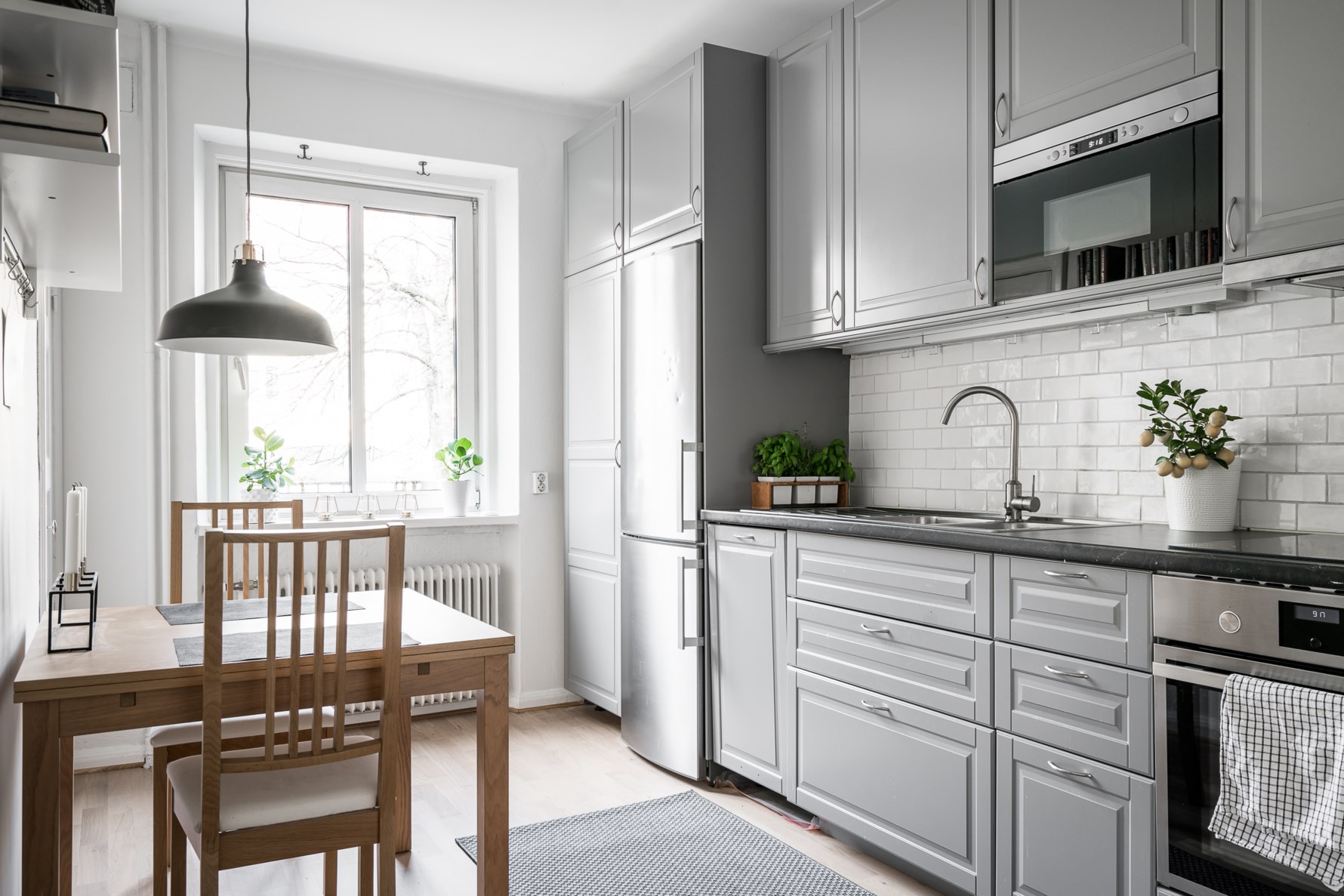 Underbart luftigt kök från 2016 med fin köksinredning i grått, laminatbänkskiva i stenimitation samt vitt liggande kakel i halvförband. I köket finns även ett bevarat gammeldags skafferi. Den maskinella utrustningen har rostfritt utförande och består av induktionshäll, kolfilterfläkt, inbyggnadsugn med varmluftsfunktion, inbyggnadsmikro, integrerad diskmaskin samt kyl med frys. I köket ryms en matplats för fyra personer och ett fönster bidrar med ljusinsläpp.