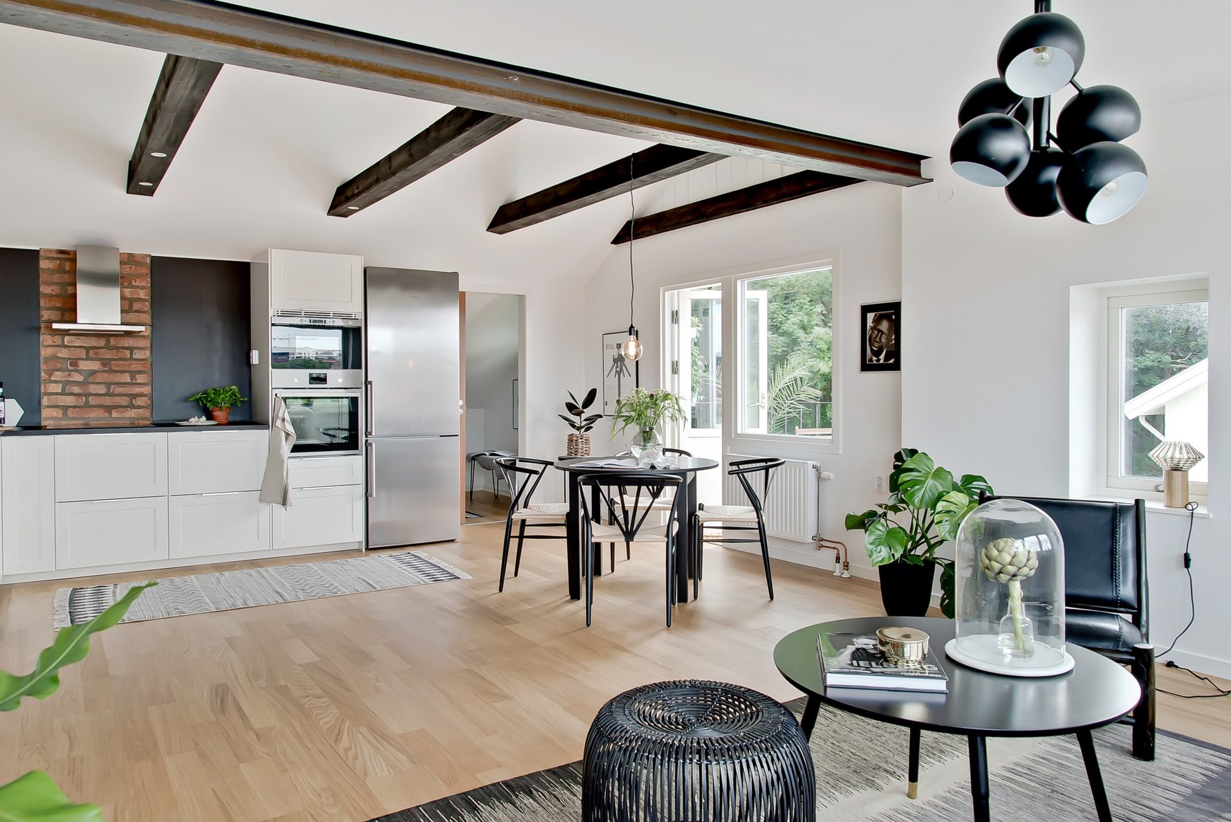 Det stora vardagsrummet och köket ligger i öppen planlösning och är lägenhetens hjärta. Här finns en magnifik utsikt över staden och områdets trädgårdar. Det höga läget bjuder på utsikt utan insyn. Fina ytskikt och parkettgolv, plats för både matbord och soffgrupp. Utgång till balkong i söderläge!