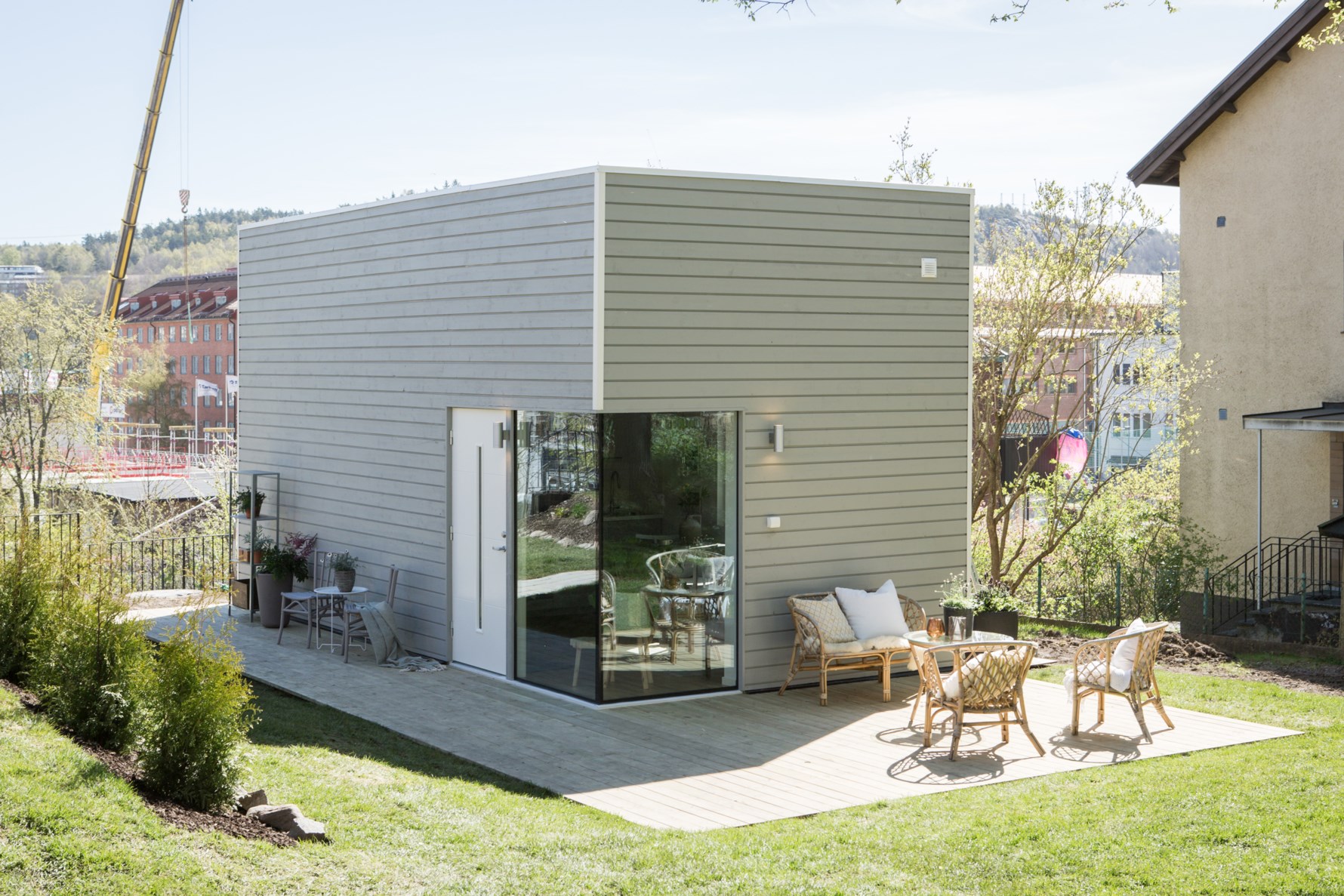 Gemensam trädgård med uteplats.