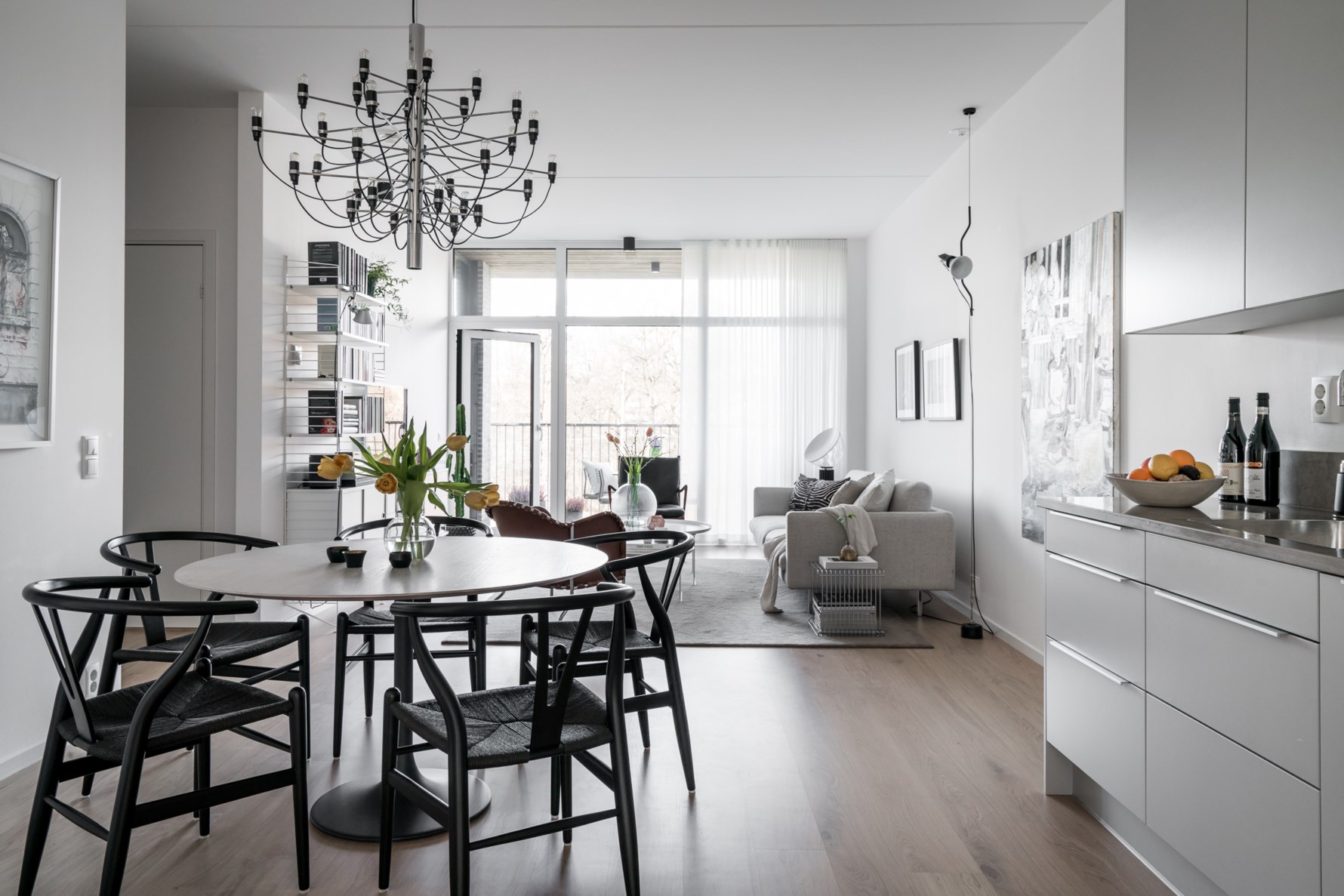 Lägenheten erbjuder generösa sällskapsytor i öppen planlösning med fint ljusinsläpp och utgång till en stor balkong i söderläge. Sällskapsytorna kan möbleras med en generös soffgrupp samt ett matsalsbord för stora middagssällskap. Det stora fönsterpartiet sträcker sig från golv till tak och ger ett exklusivt intryck i kombination med den generösa takhöjden.