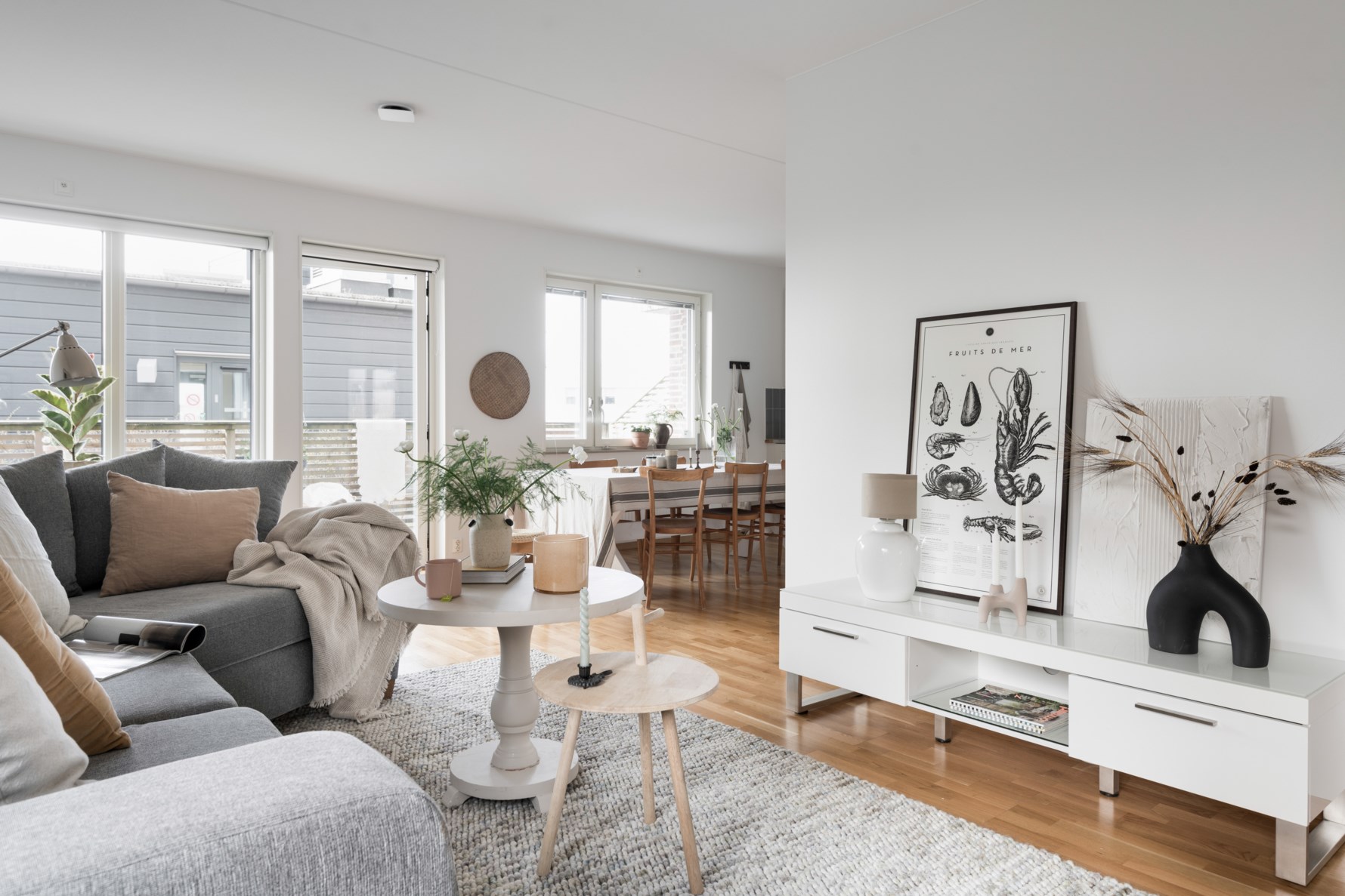 Den öppna planlösningen mellan vardagsrum och köket inger en känsla av rymd med valmöjligheter till er inredning och disponeras efter sin sociala karaktär, vilket genomsyrar hela bostaden. I anslutning finns den härliga uteplatsen som kan inredas med både loungemöbler och middagsbord.