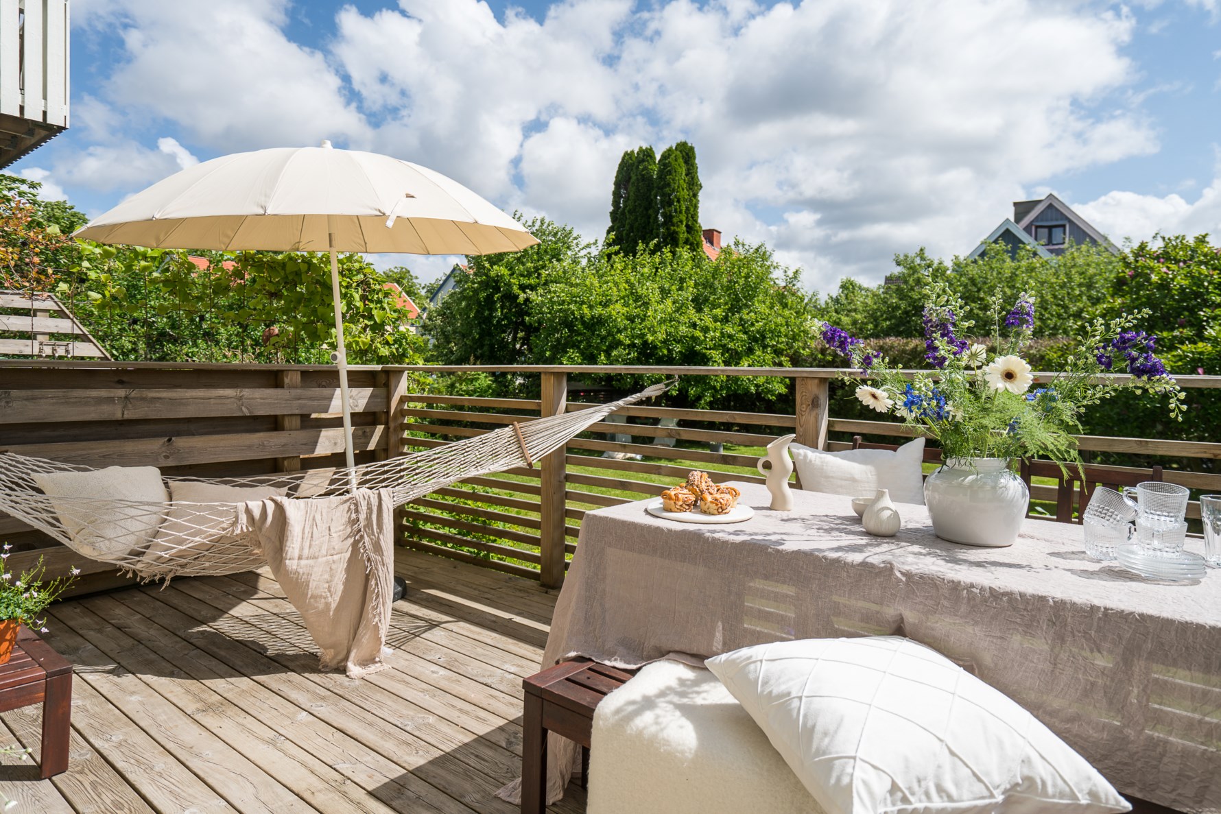 Harmoniskt sovrum med plats för dubbelsäng med tillhörande sidobord och längst ens väggen erbjuds förvaring i flertalet garderober. En unik detalj är den fondvägg som utgörs av vitmålad panel. Från sovrummet har ni direkt utgång till den underbara uteplatsen och gemensamma trädgården. En oas att slå sig ner vid en ljuv sommardag med en kopp kaffe i handen eller varför inte en kväll i goda vänners lag! Uteplatsen har gott om plats för loungemöblemang, grill, grönska och mycket mer.